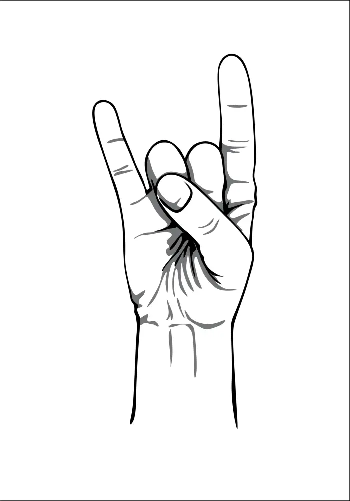 Abstraktne plakat joonistatud käega, mis tõstab kaks sõrme rock on-märgis. Jooned kujutavad kätt tugevana, kus see on asetatud valge tausta keskele. Valmistu peoks, asetades selle kirju tausta ette kodus.