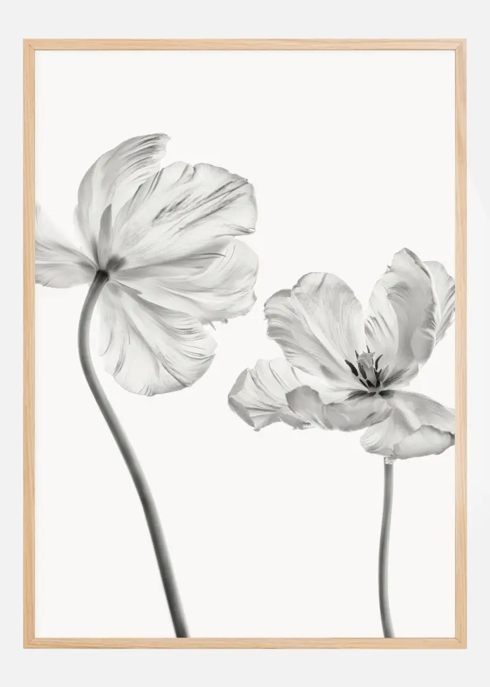Lihtne plakat kahe tulbiga. Pehmes mustvalges kujunduses on üks tulp avatud ja eestvaates, teine tagantvaates. Pilt püüab kinni kõik kroonlehtede elegantsed detailid kaunis portrees.