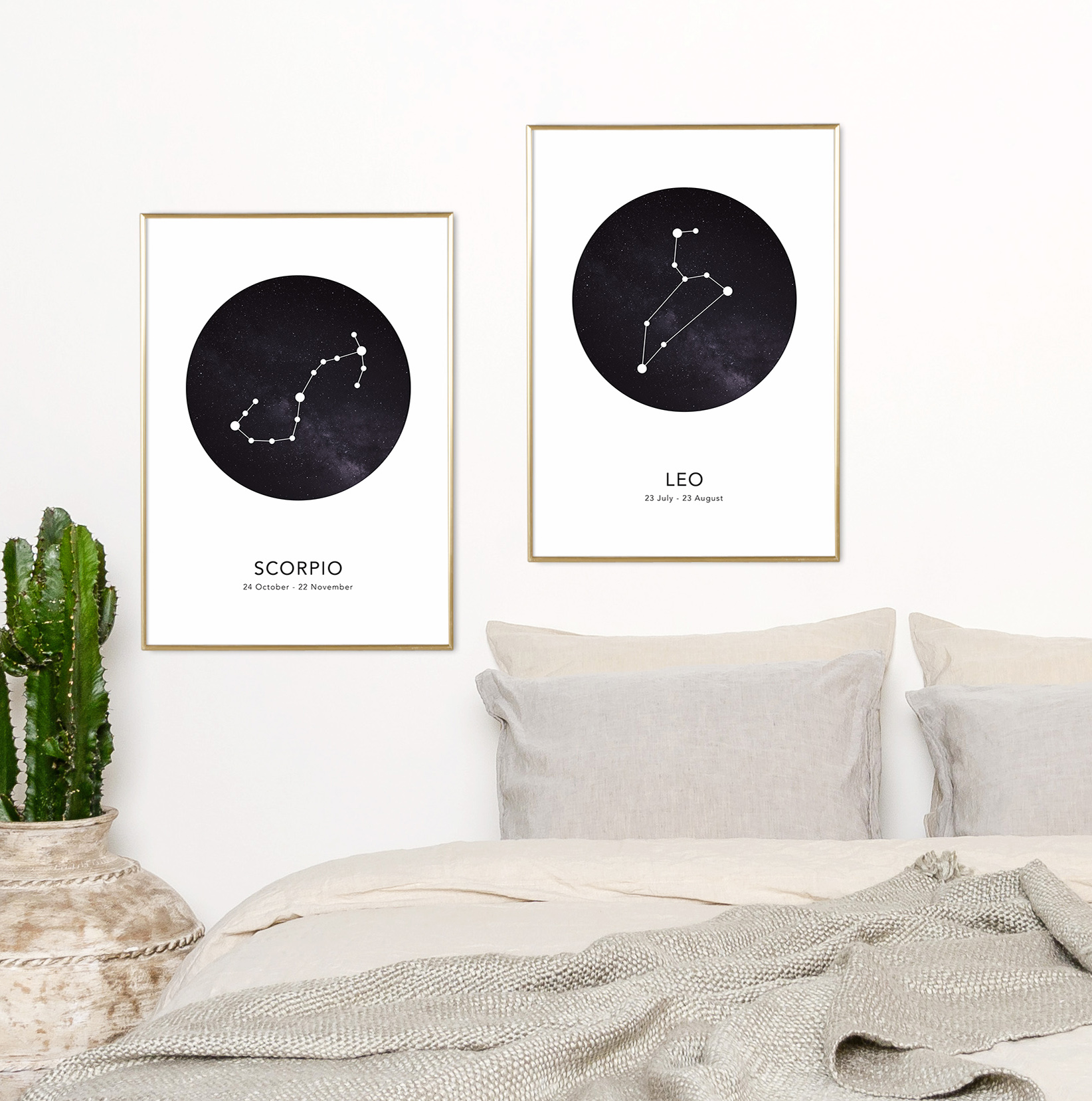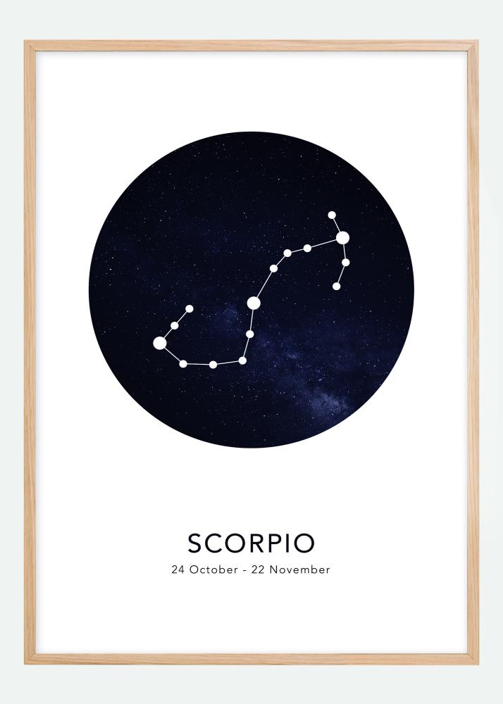 Kingitusena isikupärane maal kellelegi, keda sa armastad! See stiilne plakat kujutab Skorpioni tähemärki musta ja sinise tähetaeva taustaga. Allpool on nimi koos sobivate kuupäevadega inglise keeles.