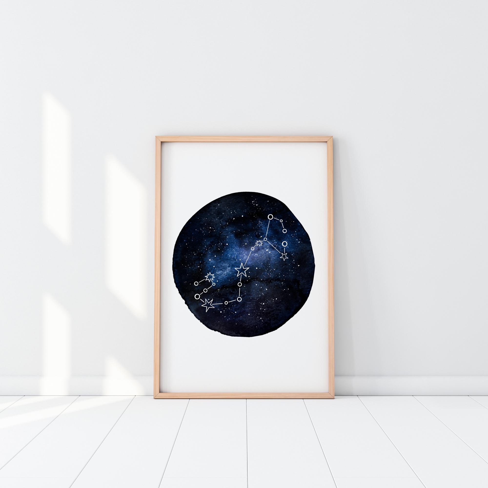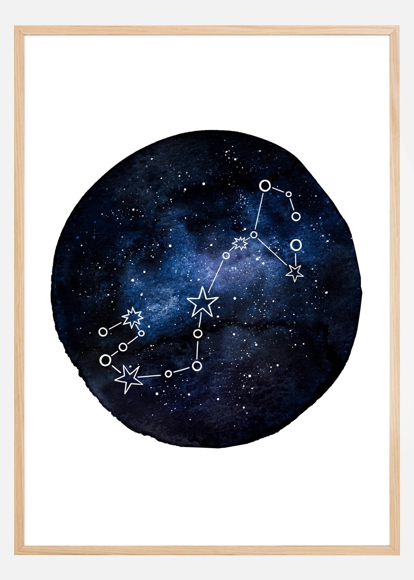 Horoskoobi plakat tähemärgiga Skorpion. Suur tumesinine ring hõljub valgel taustal. Sfääri sees on galaktika ja sadu erinevaid tähti. Ülal on Skorpioni tähemärk. Täiuslik lisand, kui soovite näidata oma tähemärki.