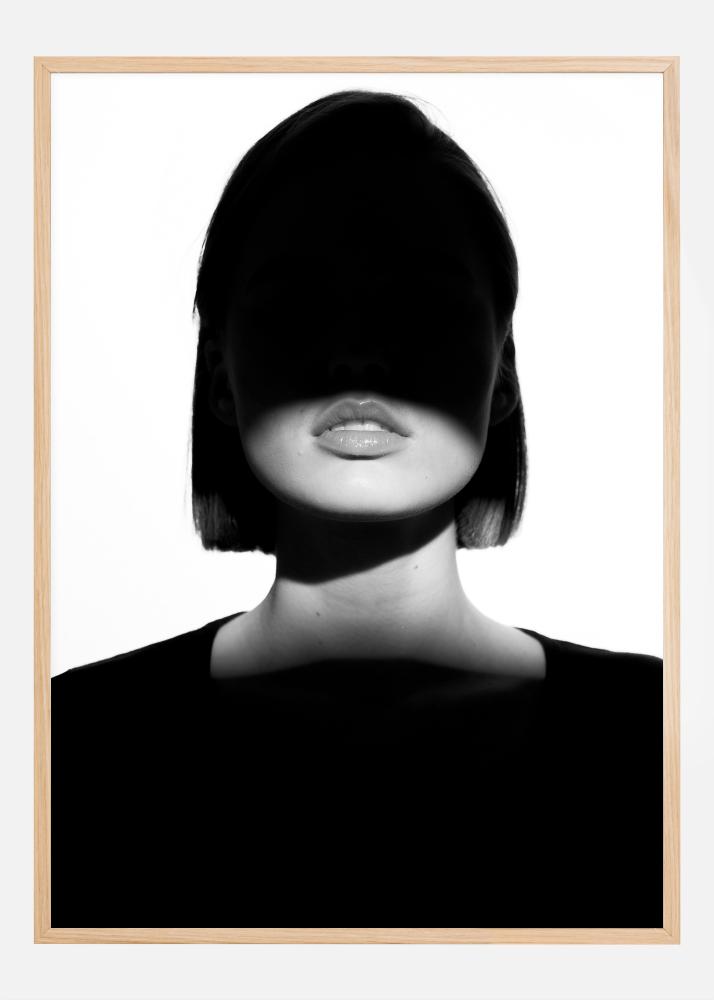 Selle silmatorkava postri kujutab võimas pilt naisest, kelle silmi varjab tume vari, luues salapärase ja mõtlemapaneva efekti. Terav kontrast valgete esiletõstmiste ja sügavate mustade toonide vahel rõhutab tema väljendunud huuli ja skulpturaalset nägu. See on pilt, mis tasakaalustab nähtavuse ja anonüümsuse, valguse ja pimeduse piiril ning kutsub vaatlejat otsima sügavamaid tähendusi.