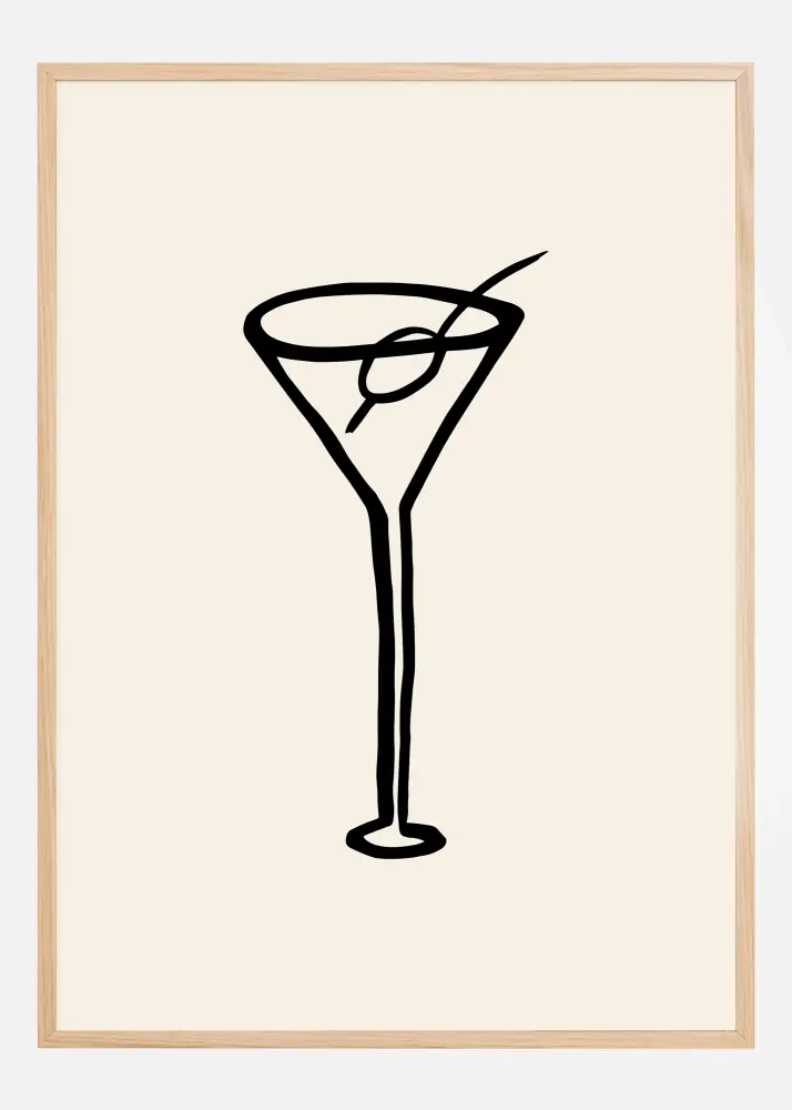 Lihtne plakat kokteiliklaasiga, milles on oliiv. Saage see James Bondi vibe, kui riputate selle lihtsa musta joonistusega martinipokaali oma seinale. Kombineerige julge seinavärviga, et see tugev joonistus õigesti esile tuleks. Kas see raputab või liigutab sind?