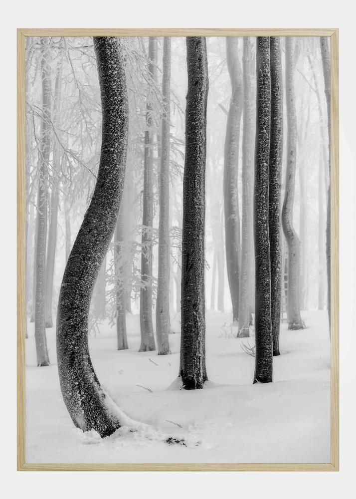 Fantastiline loodusplakat kasvavate puudega. See maagiline pilt näitab tumedaid puid lumises metsas. Too see plakat koju ja too talv oma majja imelisel viisil.