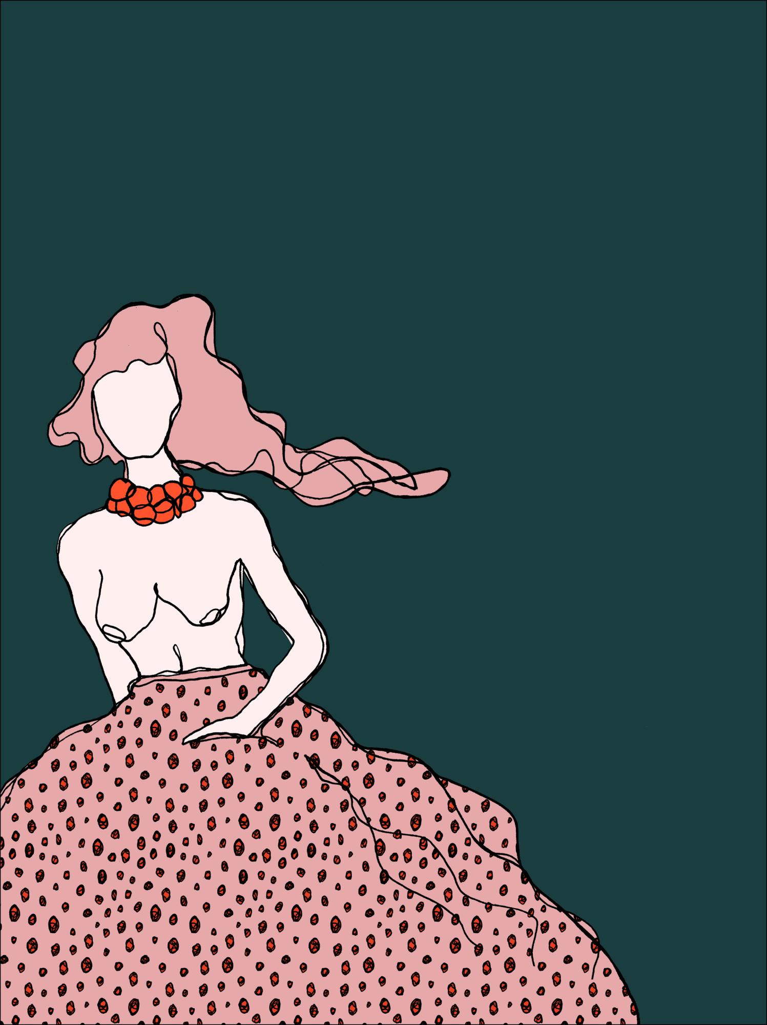 Lõbus plakat tüdrukust rohelise taustaga. Naine on topless, kandes roosat seelikut suurte laikudega, mis laiali lainetab. Tema roosapunased juuksed lehvivad külgsuunas nähtamatus tuuleiilis. Heleoranžid pärlid kaunistavad tema kaela. Üks käsi taskus, annab see liikumises oleva naise visand lõõgastunud tunde, ideaalne kerge ja laheda seinavalgusti jaoks.