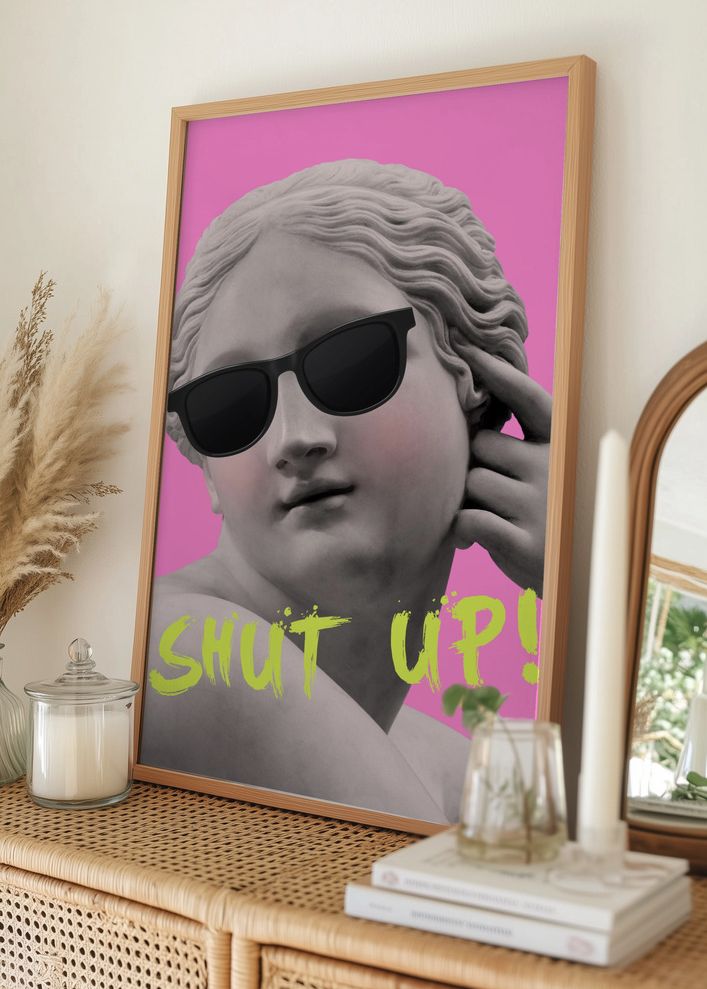 See moodne plakat ühendab klassikalise kunsti mässumeelse pöördega. Kujutisel on skulptuur, millel on lahe hoiak, peas mustad päikeseprillid ja tekst "SHUT UP!" elavas kollases värvitoonis. See ainulaadne print sobib suurepäraselt neile, kes soovivad oma koju tuua trendikat ja humoorikat meeleolu. Ideaalne noortetuppa või neile, kes armastavad reegleid murda.