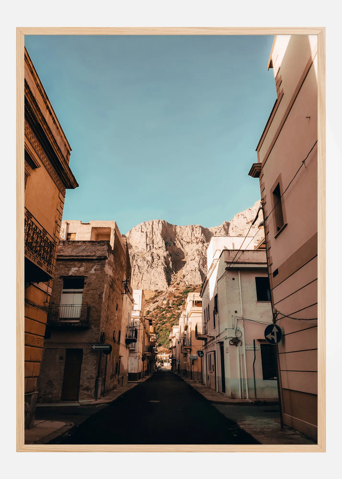 See lummav plakat tabab piltpostkaarti olemuse Sitsiilia külas Cinisi, selle soojad maa toonid ja taustal muljetavaldav mägi, mis tõuseb vastu kirkassinist taevast. Hoone heledad roosad ja kollased toonid moodustavad ilusa kontrasti taustal oleva karmi mägist maastikuga ning loovad rahu ja vaikuse tunde. See trükk on austusavaldus Sitsiilia maalähedasele võlule ja selle võimele ühendada loodust ja kultuuri harmooniliseks tervikuks.