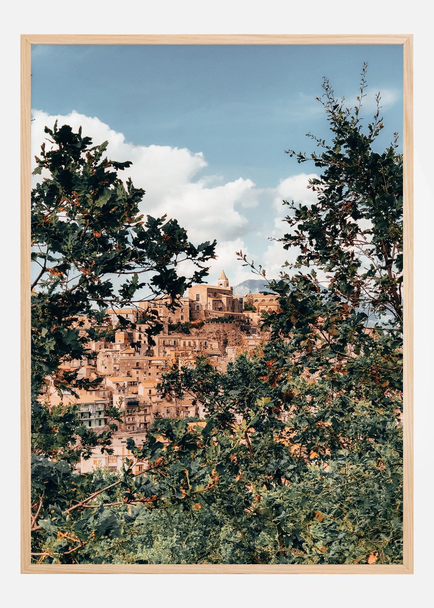 See detailirohke plakat köidab pilku elava vaatega keskaegsele linnale, mis ronib ülespoole pilvede ja sinise taeva poole. Linn, mis asub Sitsiilia südames, on rikkaliku ajaloo ja kultuuriga, mis paistab silma sooja tooniga hoonetes ja ajaloolistes kirikutornides. Rohelise lehestikuga ümbritsetuna annab see plakat tunde, nagu avastaks peidetud pärli, koha, kus igal kivil ja katusel on oma lugu rääkida.