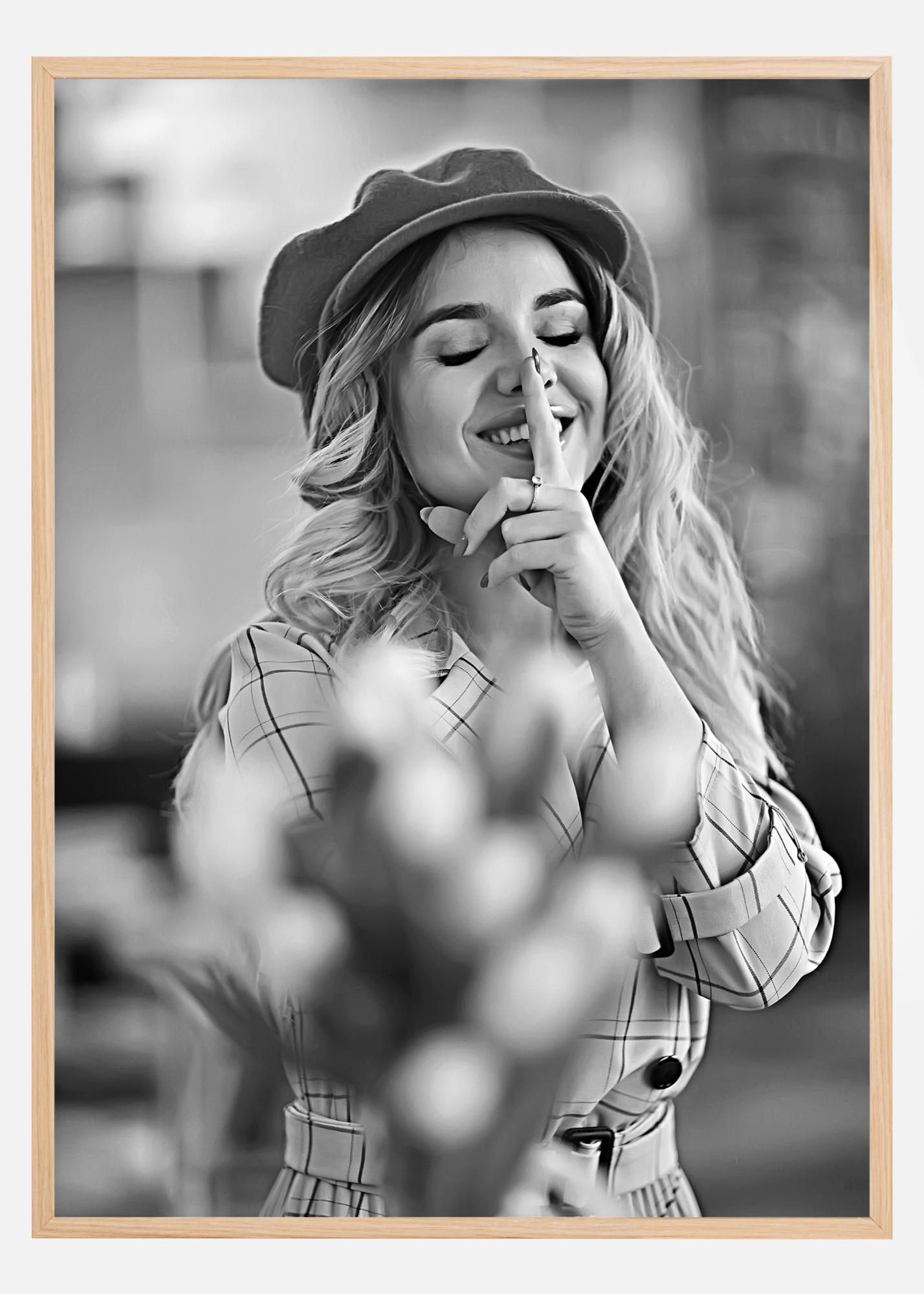 Hull portreeplakat tüdrukuga, kelle sõrm on huultel. Tema blondid juuksed langevad alla mütsi alt ja see armas tüdruk muigab laialt, kui tõstab rahustavalt sõrme huultele. See mustvalge teos parandab iga päev sinu tuju, kui ärkad ja seda vaatad.