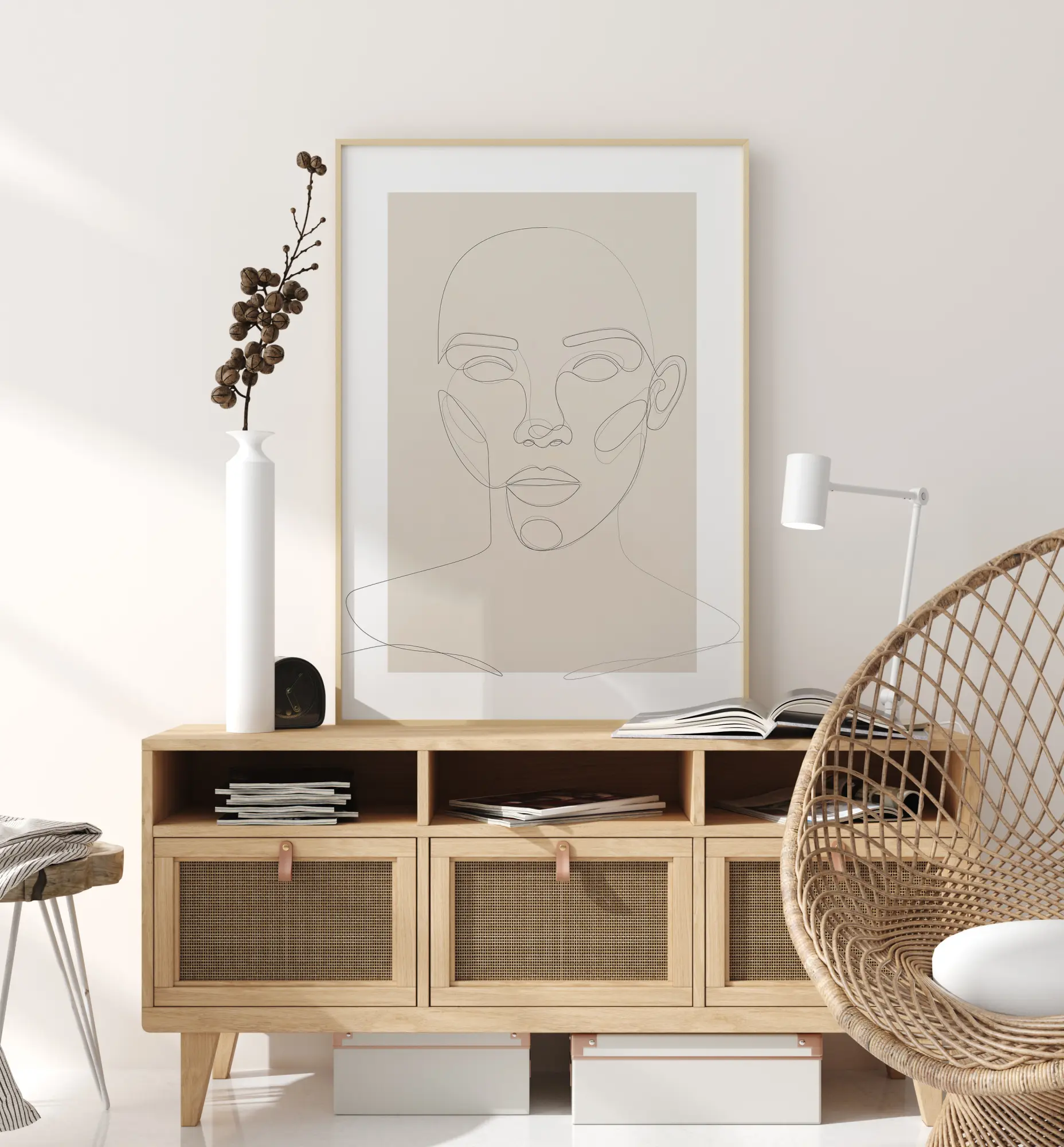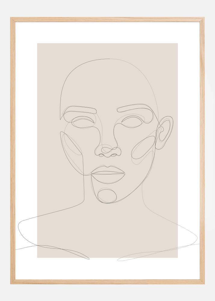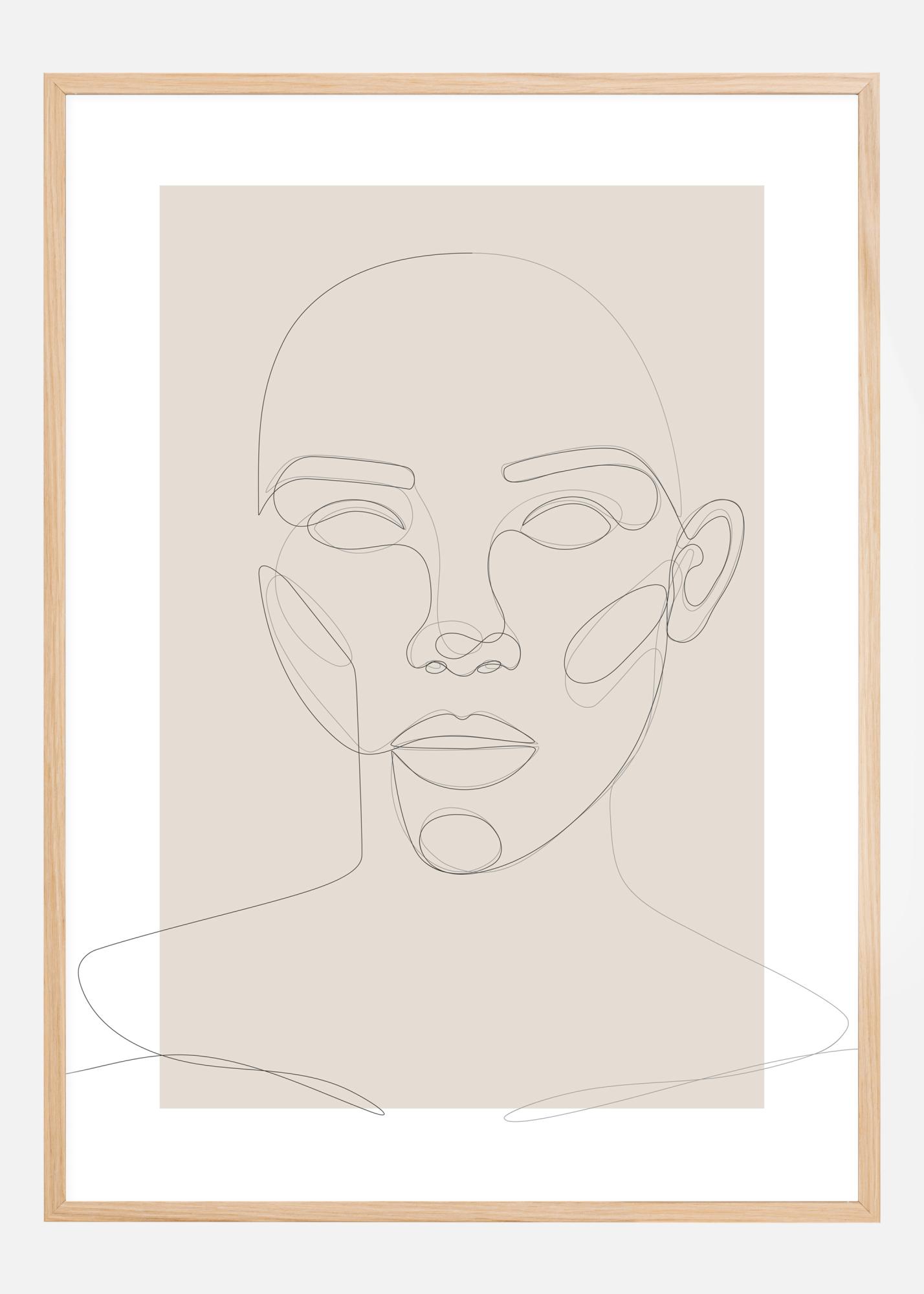 Lihtne abstraktne plakat näoga, mis on loodud õhukeste joonte abil. Nägu vaatab otse välja ja on loodud ühe pika voolava joone abil, mis kujutab kõiki näo peamisi omadusi põnevalt. See pilt on tehtud hallil taustal ja sobib kõige paremini neutraalsele seinale.