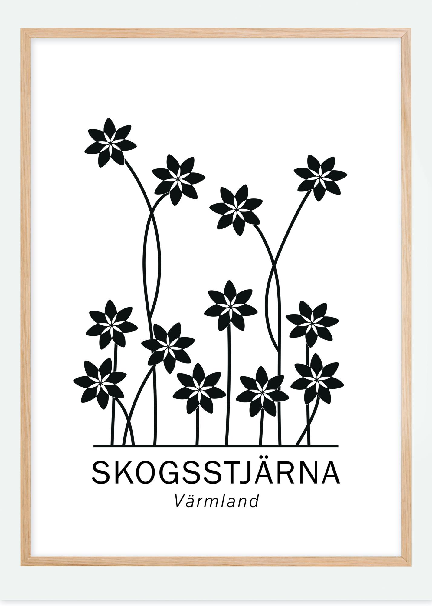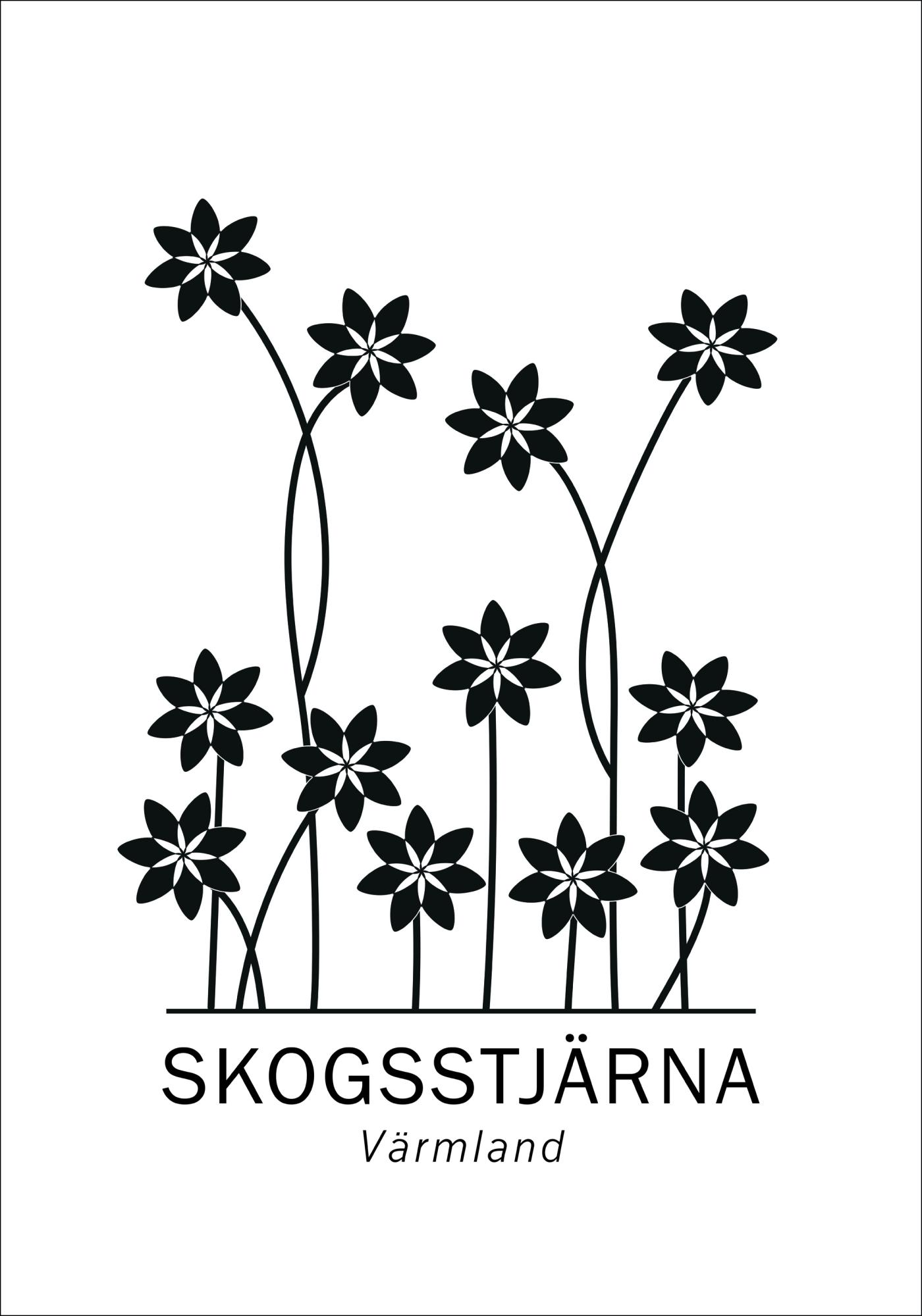 Logotüüpne plakat lillede seeriatega abstraktsel trükkvormil. Lilledel on kõigil ühtne kuju ning need on musta värvi. Kõik asetsevad valgel taustal sõnadega Skogsstjärna Värmland allpool. Riputage see üles, et saada kodus seinale lõbus tuulutus.
