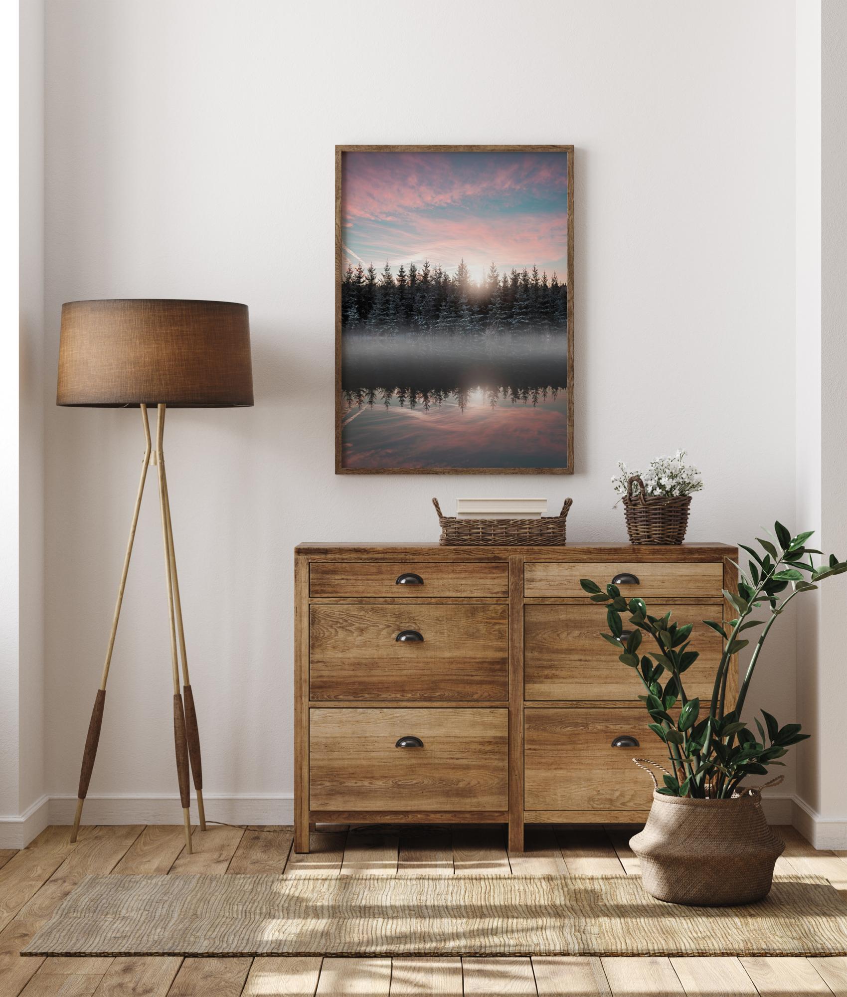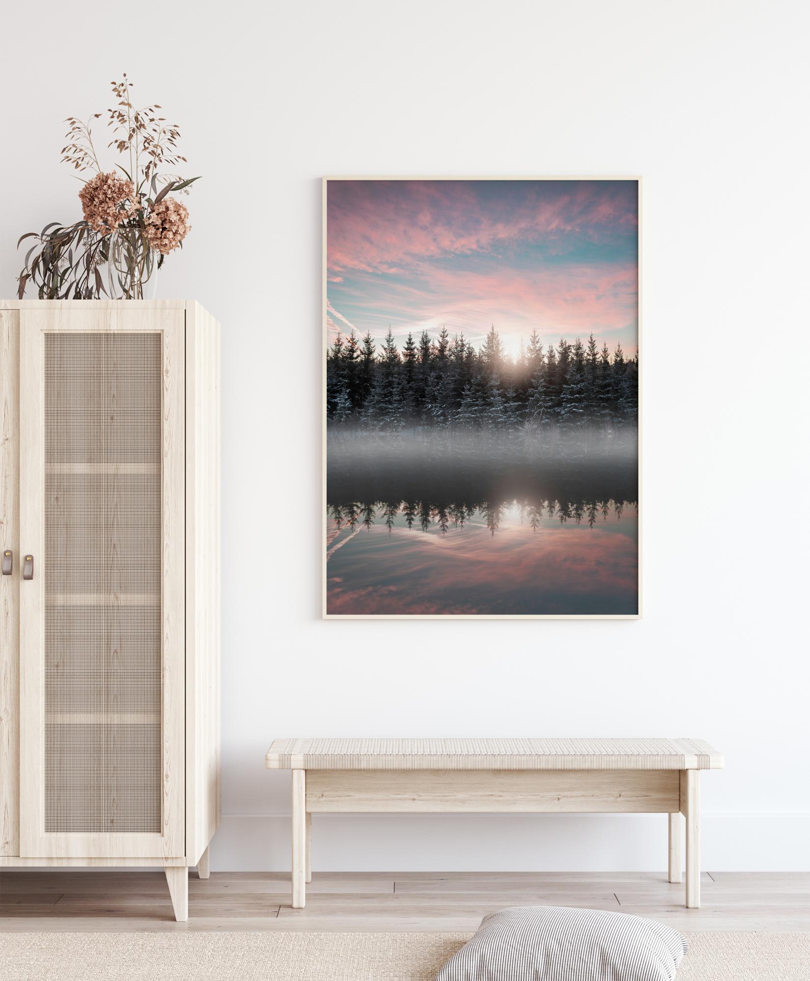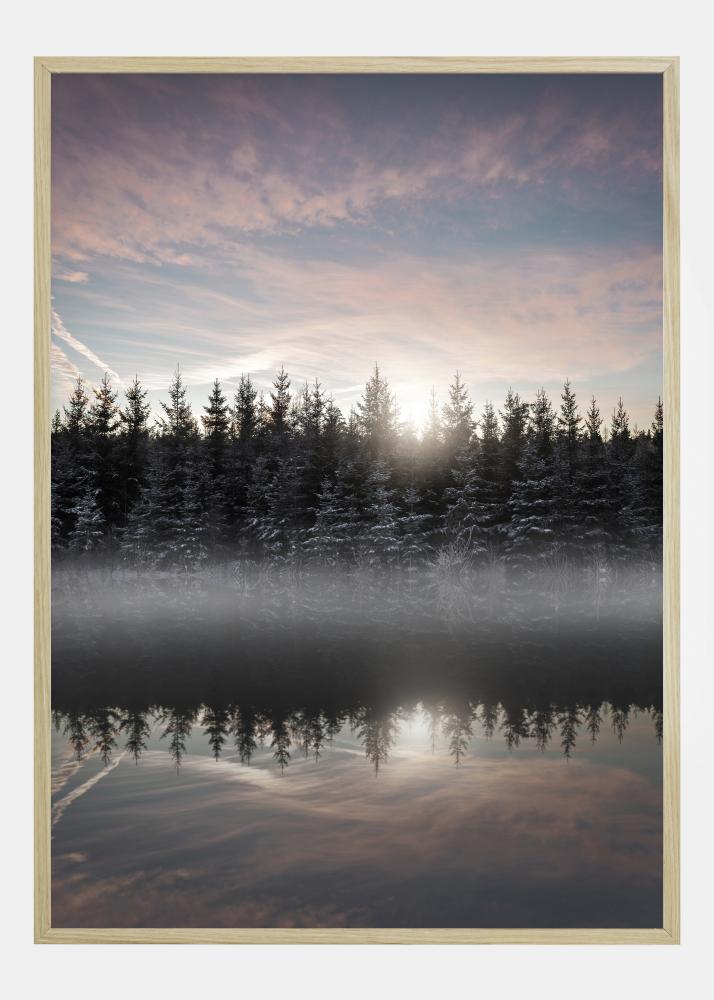 Maagiline plakat udusse mähitud järvega varajases hommikuvalguses. Lumi katab rannal seisvaid puid, mis on osaliselt uduga kaetud. Puude peegeldus paistab järve pehmetes pastellvärvides. Puulatvade kohale tõuseb päike, heites pehme valguse roosale ja sinisele taevale, luues rahuliku atmosfääri.