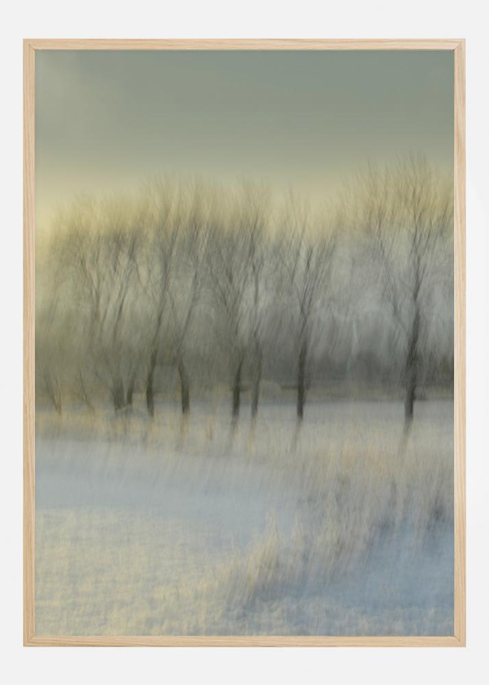 Võrratu plakat liikumishägu stiilis puude talvise taustaga. Valge lumi katab kõike selles pehmes, fookuseta pildis. Puud on udused, nähtavad on vaid kõrged mustad tüved ja pehme kollane riba hõljub üle puulatvade. Maagia justkui hõljub õhus.