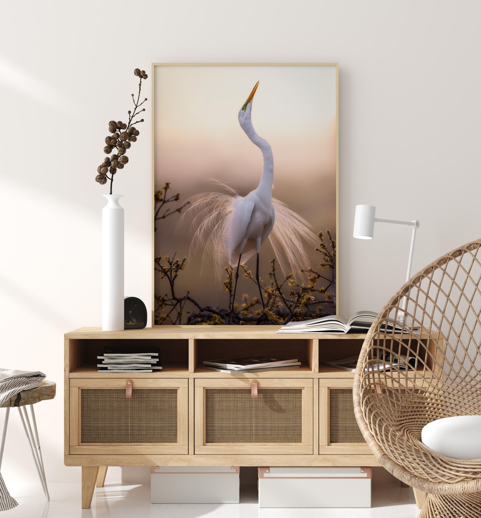Loomaplakat valge toonekurega, kes tantsib hommikuvalguses. Toonekure uhke valge keha pehme päikeseloojangu taustal, mis paistab läbi sulgede, loob sürreaalse stseeni. Ärgake igal hommikul imestustundega, tänu sellele prindile.