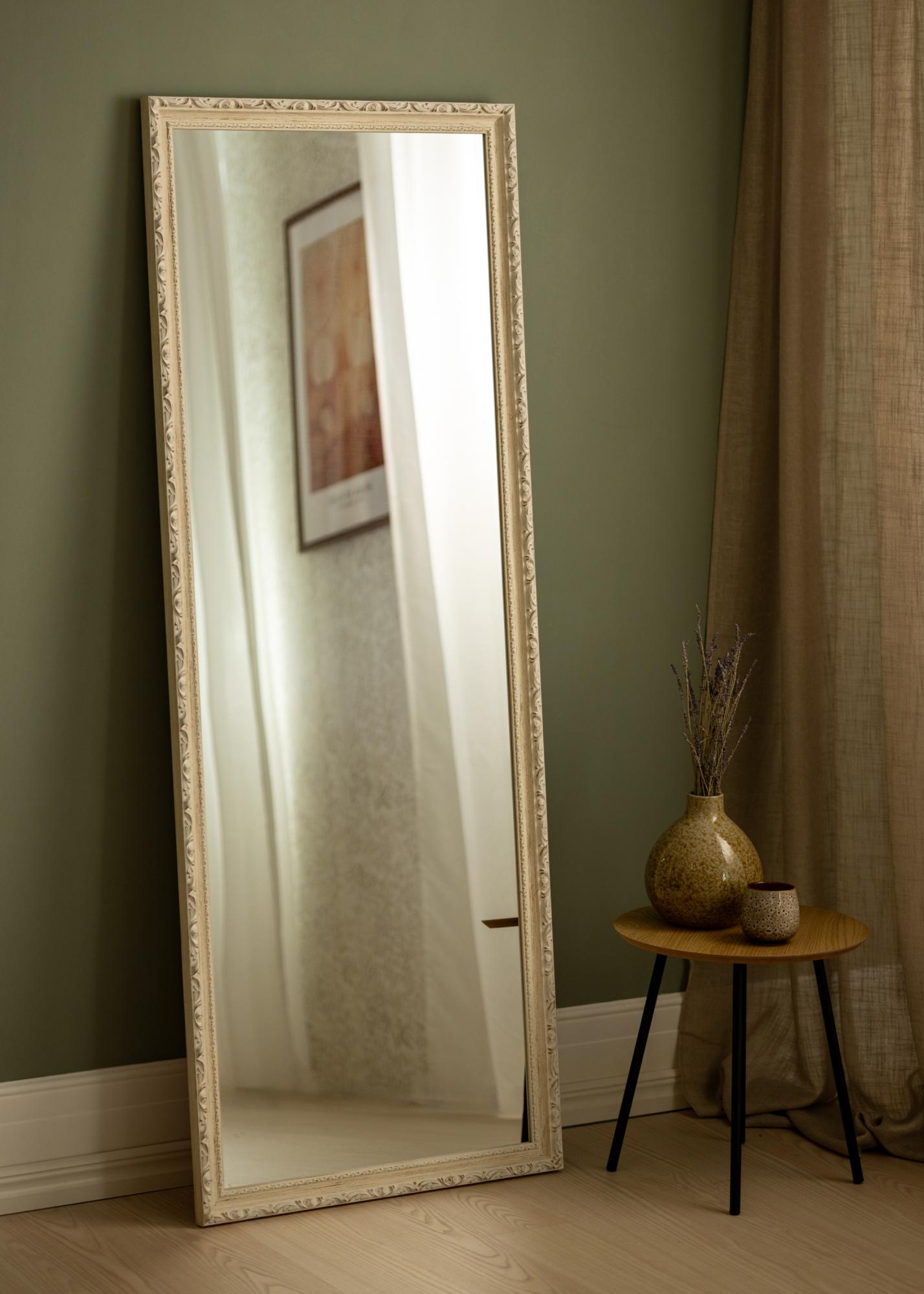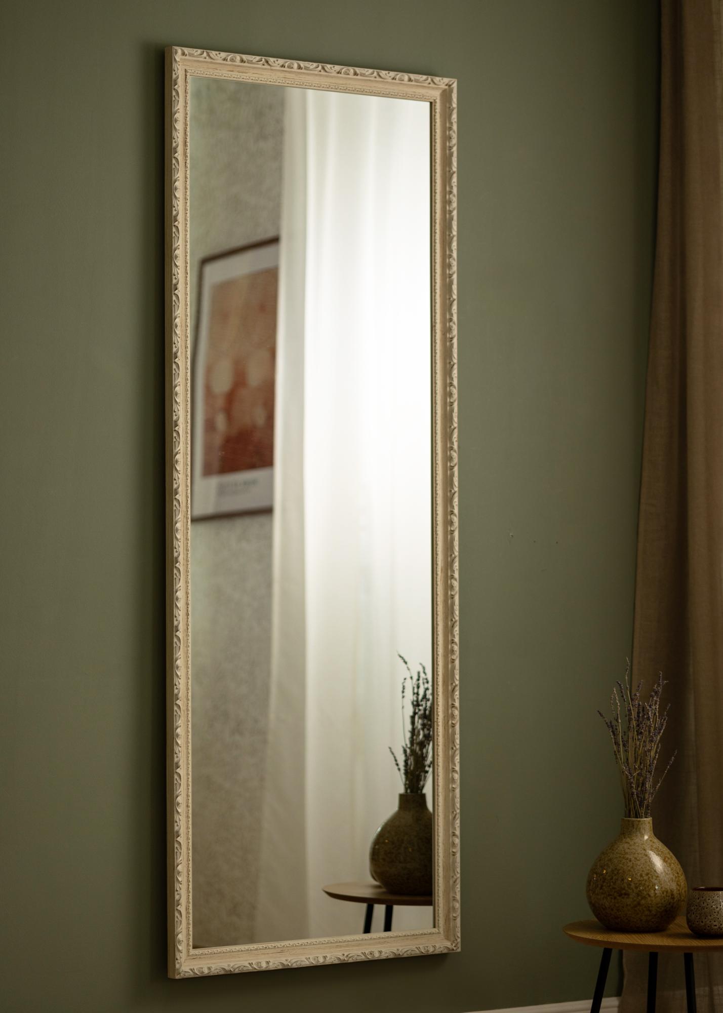 Käivita raamivalija »Valge peegel antiikstiilis nähtavate puukiududega ja laiusega 40 mm. Suurepärane valik, kui otsid peeglit, mis torkab silma ja võtab ruumi.