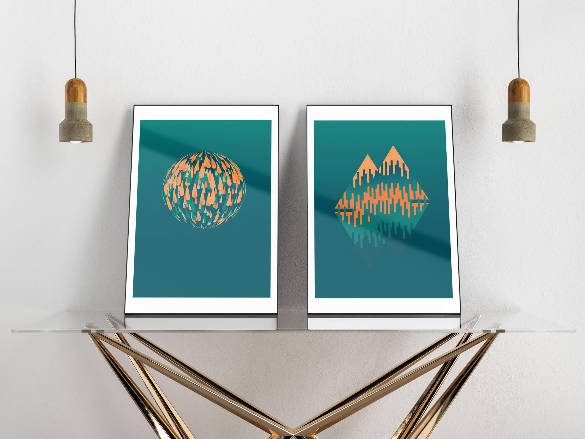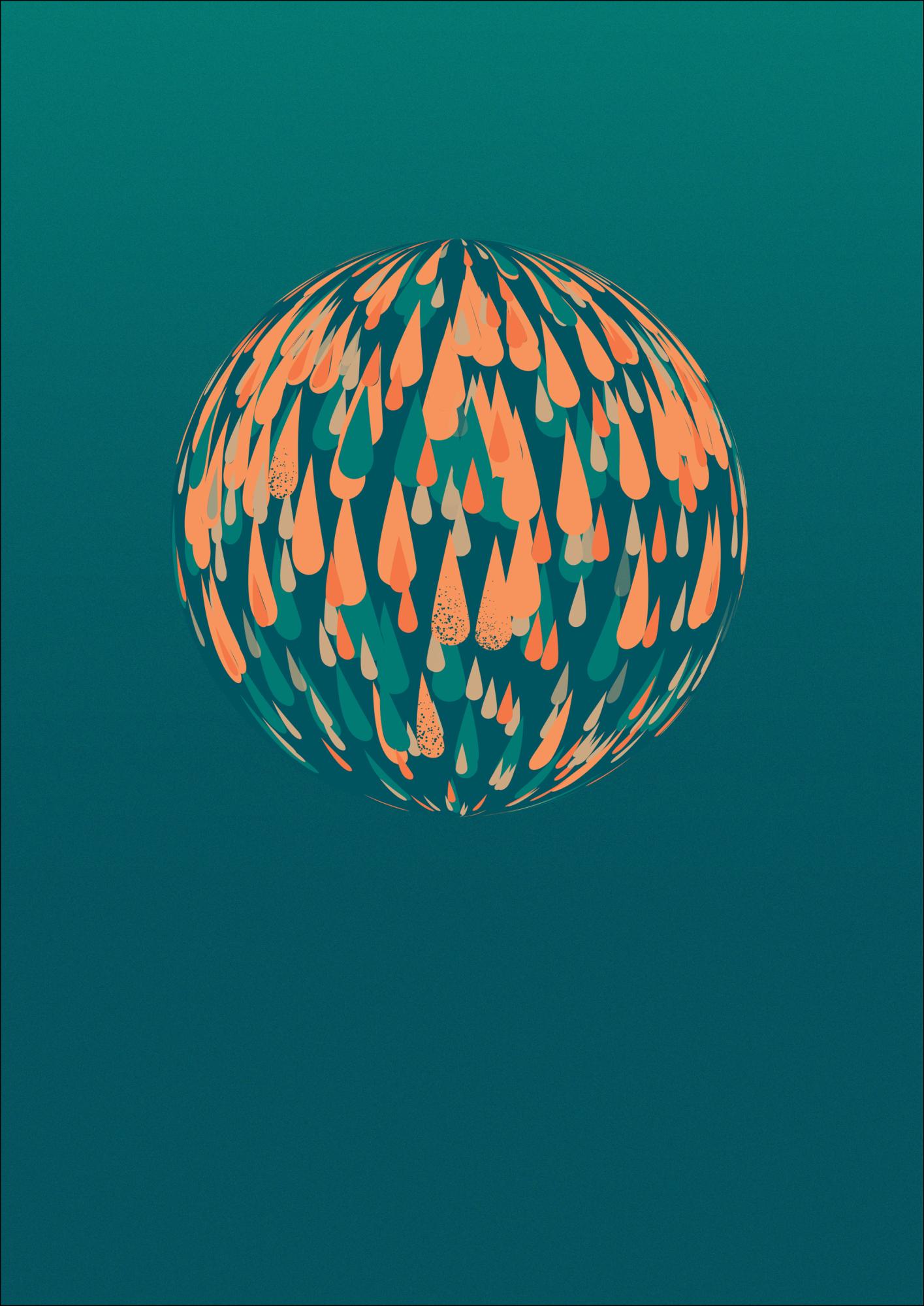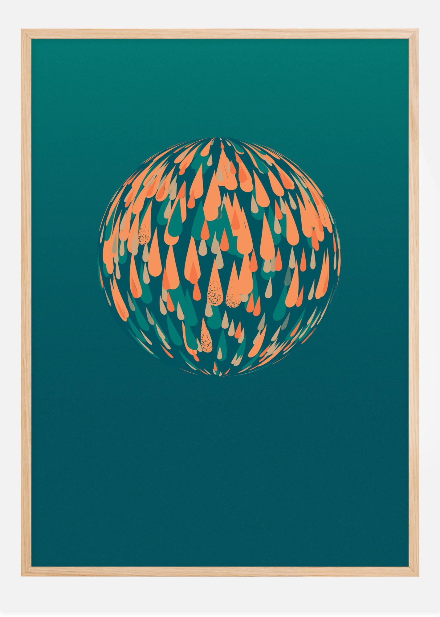 Hele plakat, millel on heleroheline tilkade sfäär. Oranžid ja sinised tilgad loovad kolmemõõtmelise sfääri vapustava rohelise tausta peal. See lihtne, ent elegantne pilt on lummav, nähes kõiki tilkasid sfääri all jagunemas. Riputage see pilt tavalisele siledale seinale, et mitte värve üle võimendada.