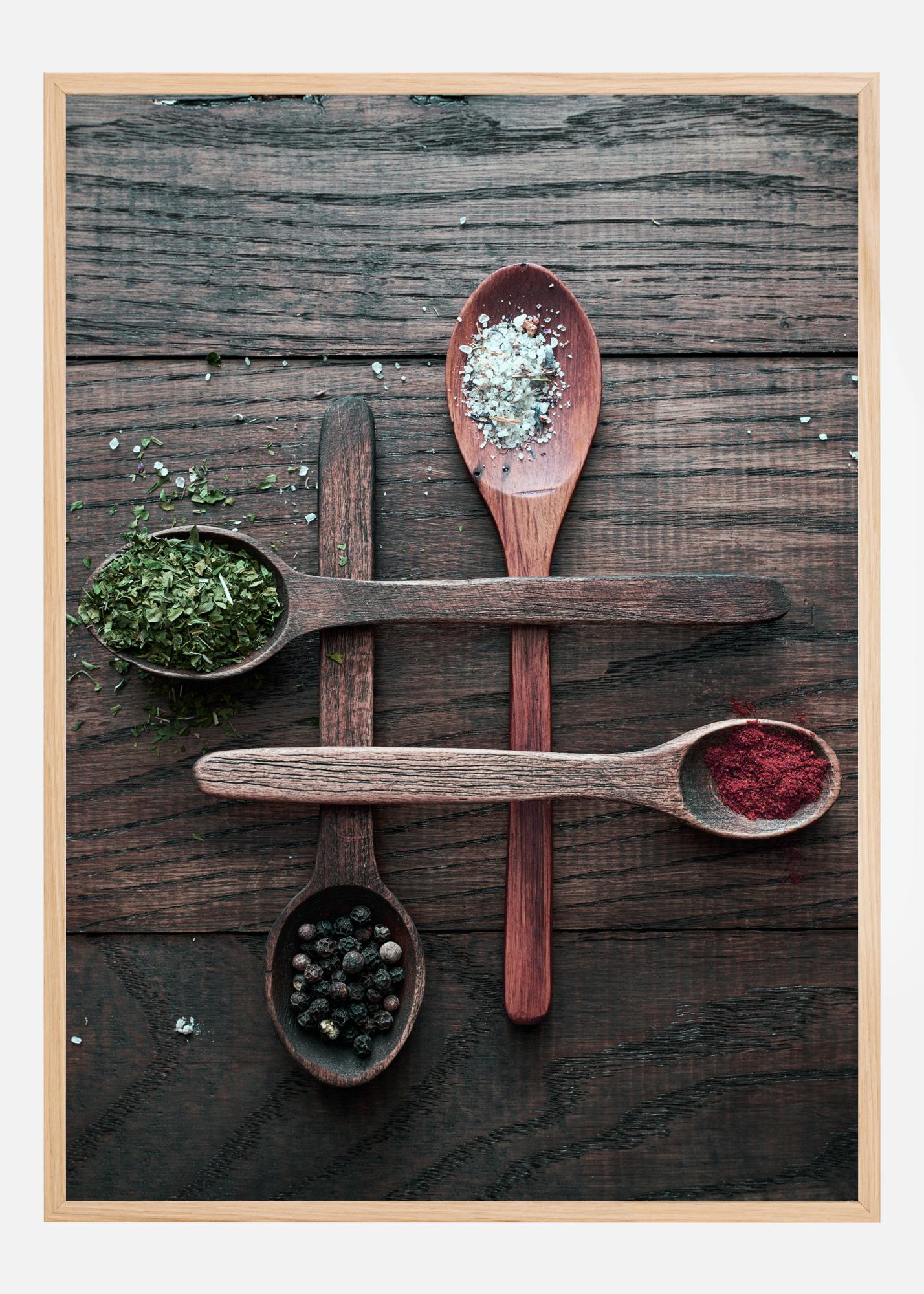 Natüürmort-plakat nelja puulusikaga, millest igaühes on vürts. Neli lusikat ristuvad omavahel ja moodustavad ruudustiku rustikaalsel puidust laual. Iga lusikaga on välja voolanud ürte ja vürtse, mis loovad lõbusa toiduvalmistamise atmosfääri, ideaalne sinu köögi inspiratsiooniks.