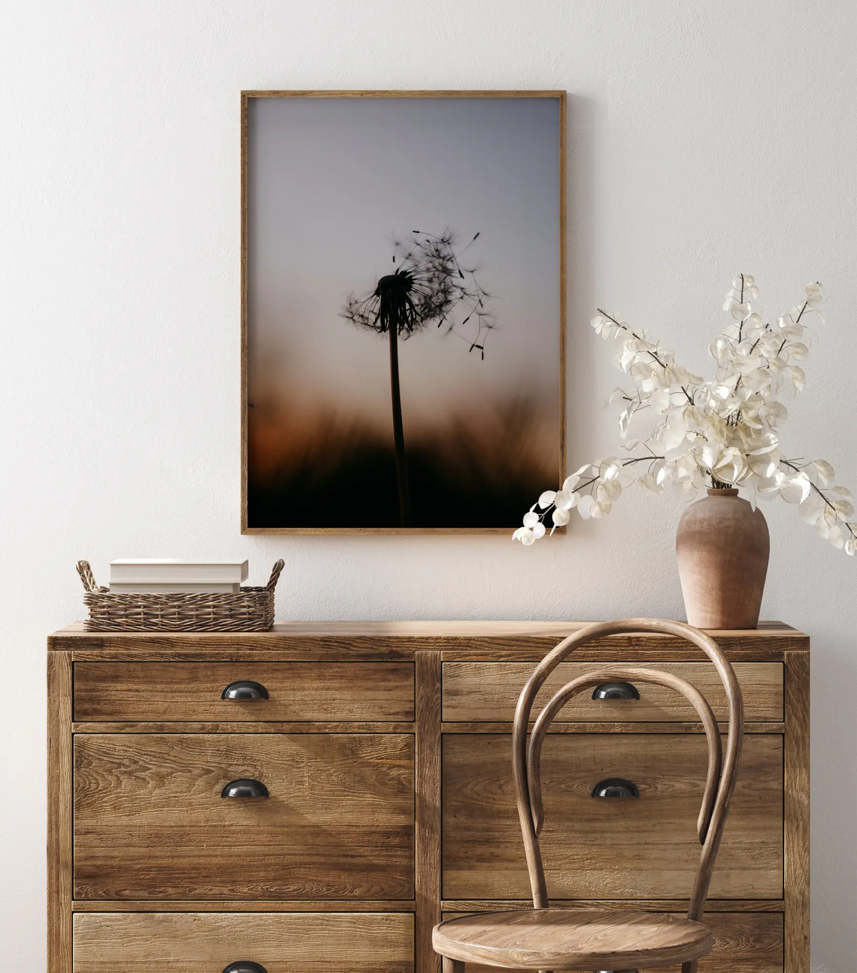 Elegantne plakat võilillekellaga, mille pool seemnetest on ära puhkunud. Kell asub pildi keskel siluetina. Sinine taevas toob esile üksikud seemned suurepäraste detailidega. Allpool olev pehme oranž rohi tekitab soojustunde, kui tuul läbi puhub.