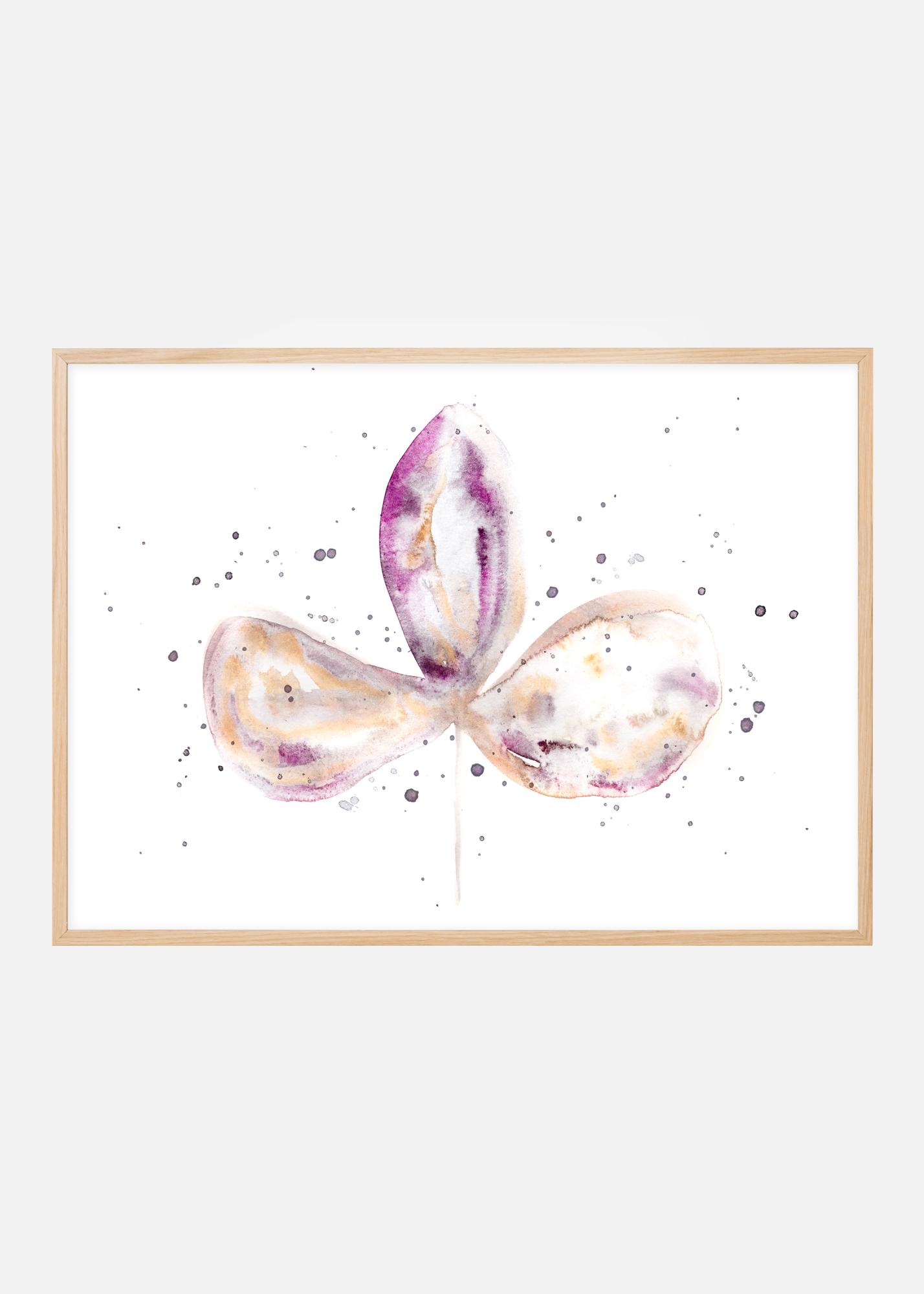 Helge plakat kolme lilla kroonlehaga valge tausta keskel. Erinevad lilla toonid loovad need pehmed laienevad lehed. Lilla värvi täpid levivad lehtedest, luues abstraktsema tunde. Tõstke värvid esile, riputades see lilla seinale.