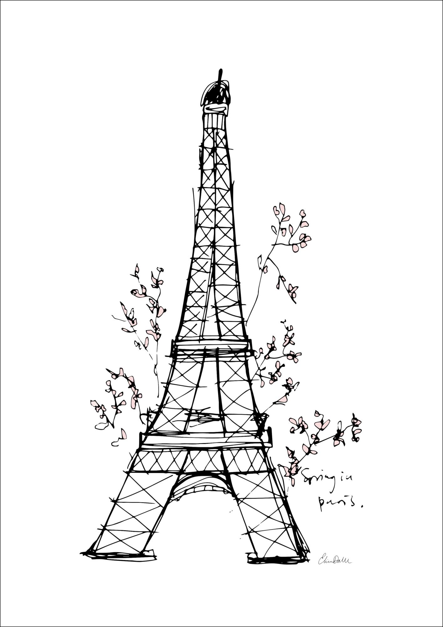 Plakat Eiffeli torni lihtsa tindijoonistusega. Pildi kraapivad jooned ja torni ebaühtlane paigutus keskel aitavad anda sellele illustratiivse kvaliteedi. Suured õitsevad oksad ulatuvad torni taha, et anda Pariisi kevadetunnet.