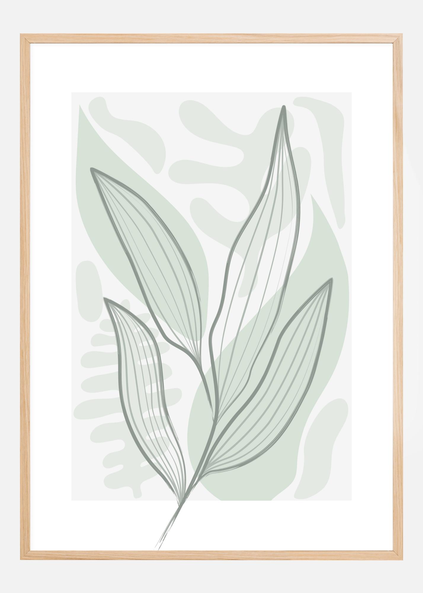 Abstraktne plakat lehtedega lihtsal rohelisel taustal, millel on erinevad lehekujud ja mustrid. Pehme rohelise ja halli värviga lihtne lehedisain, mis on piiratud tugeva halli joonega, annab tugeva, kuid pehme kevadetunde, mida saab riputada igasse kodu ruumi.