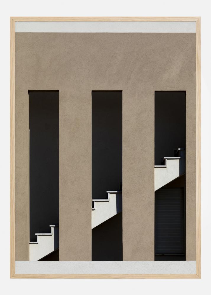 Plakat linnakeskkonnas, kus trepid tõusevad suurte aknaavade taha. Imeline abstraktne pilt, kus geomeetrilised vormid loovad korra tunde selles dramaatilises pildis. See pilt lisab sinu kodule kunstilist hõngu.
