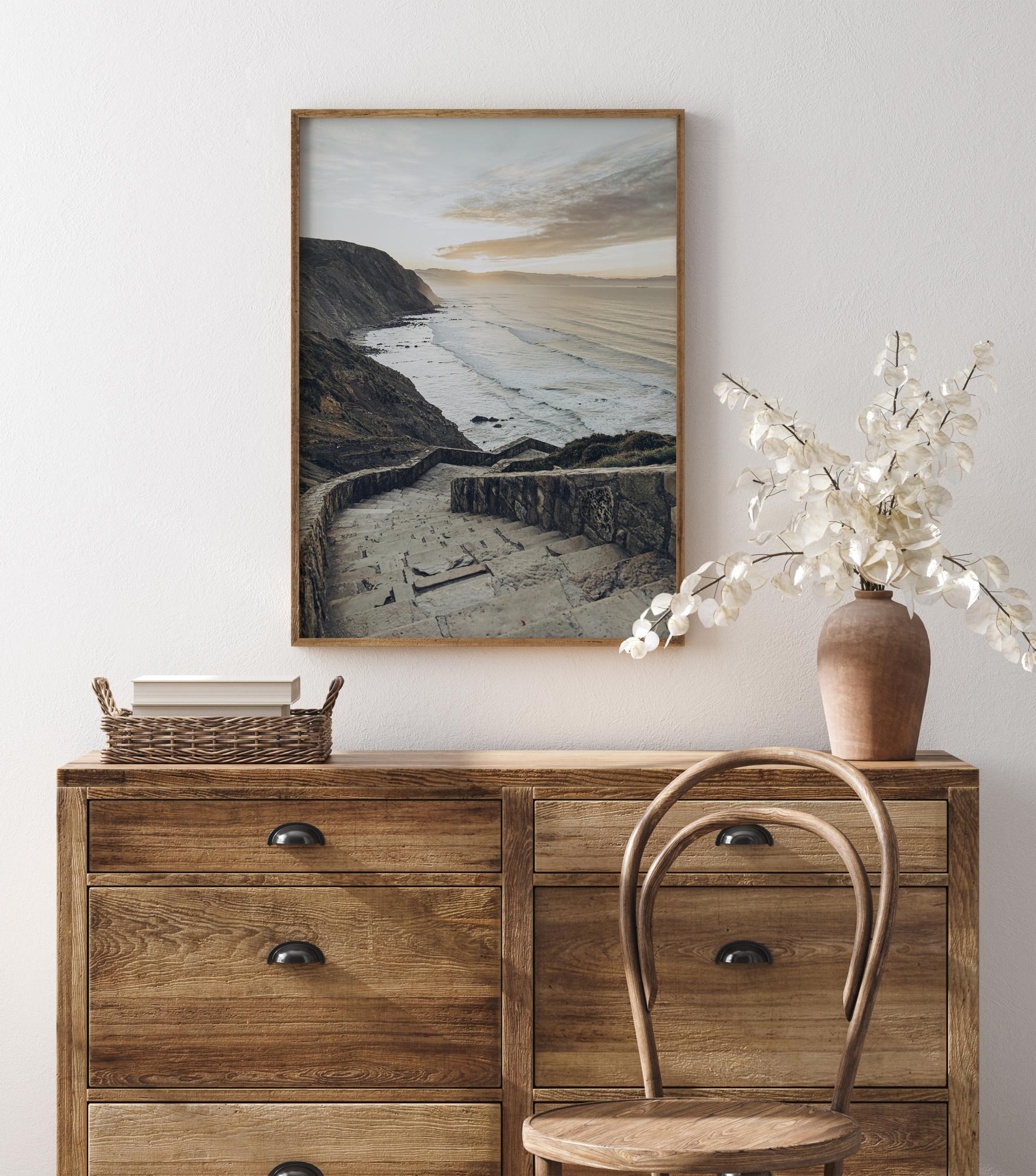 Imeline maastikplakat, millel on lai vaade merele ja rannale. Suured kivist trepid viivad kaljust alla rannani, mis peegeldab kauguses neemiku kuju. Lained löövad vastu kivist randa selles pehmes pastelltoonide pildis.