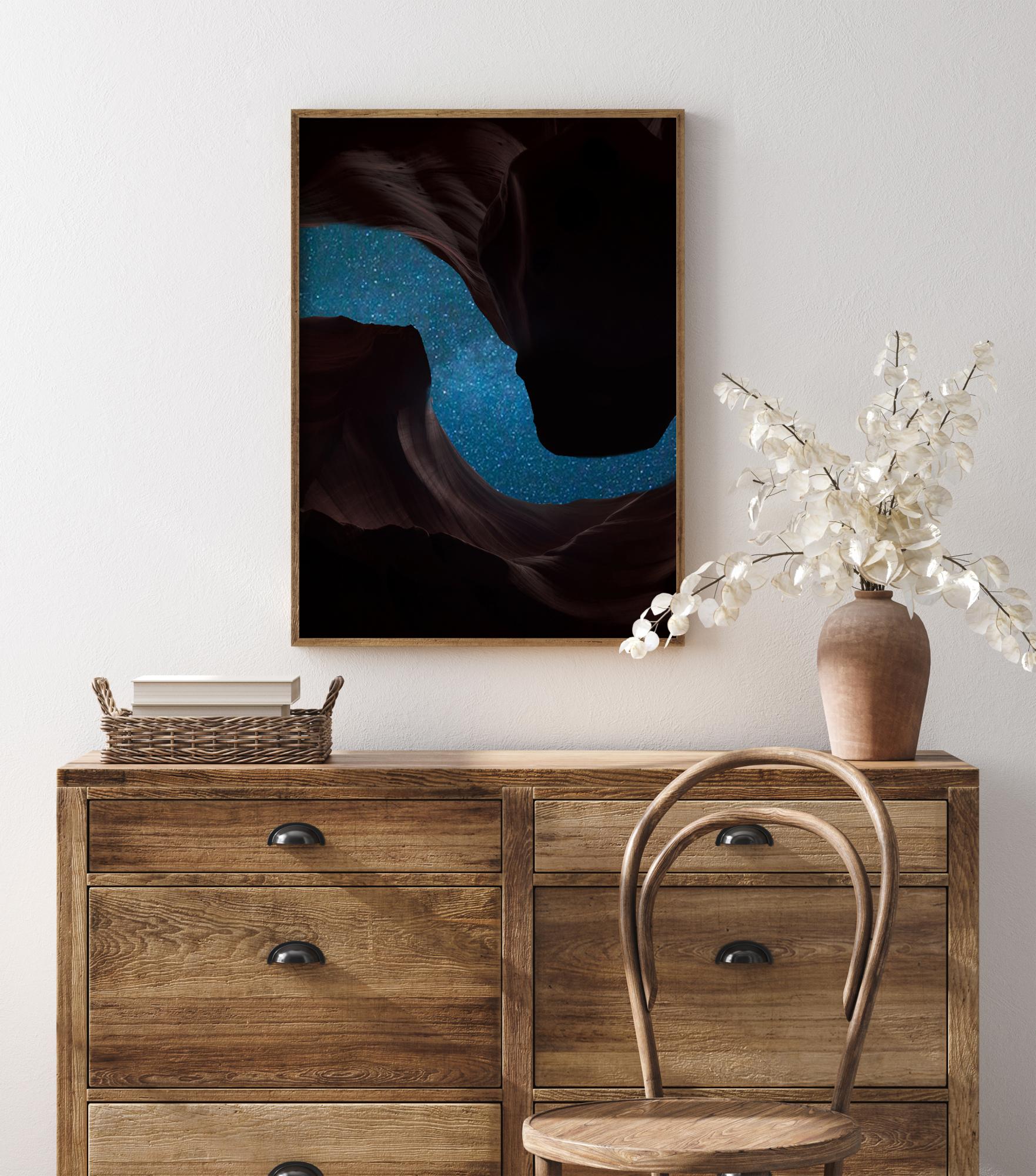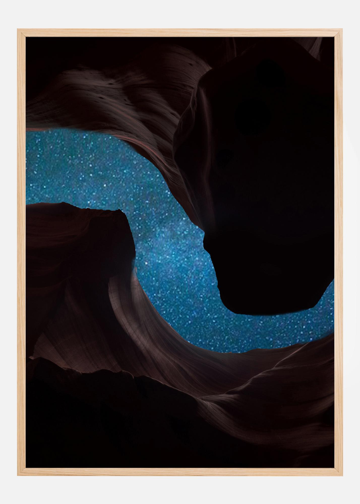 Suurepärane ööposter, millel on tähtede rikka taevaga taevas, mis paistab välja dramaatiliste kaljuformatsioonide vahel. Sügavpunased kaljud keerlevad pildi üla- ja alaosas, luues tähevalmise tee öötaeva sära läbi lummava pildi, mis on loodud aukartuse tekitamiseks.