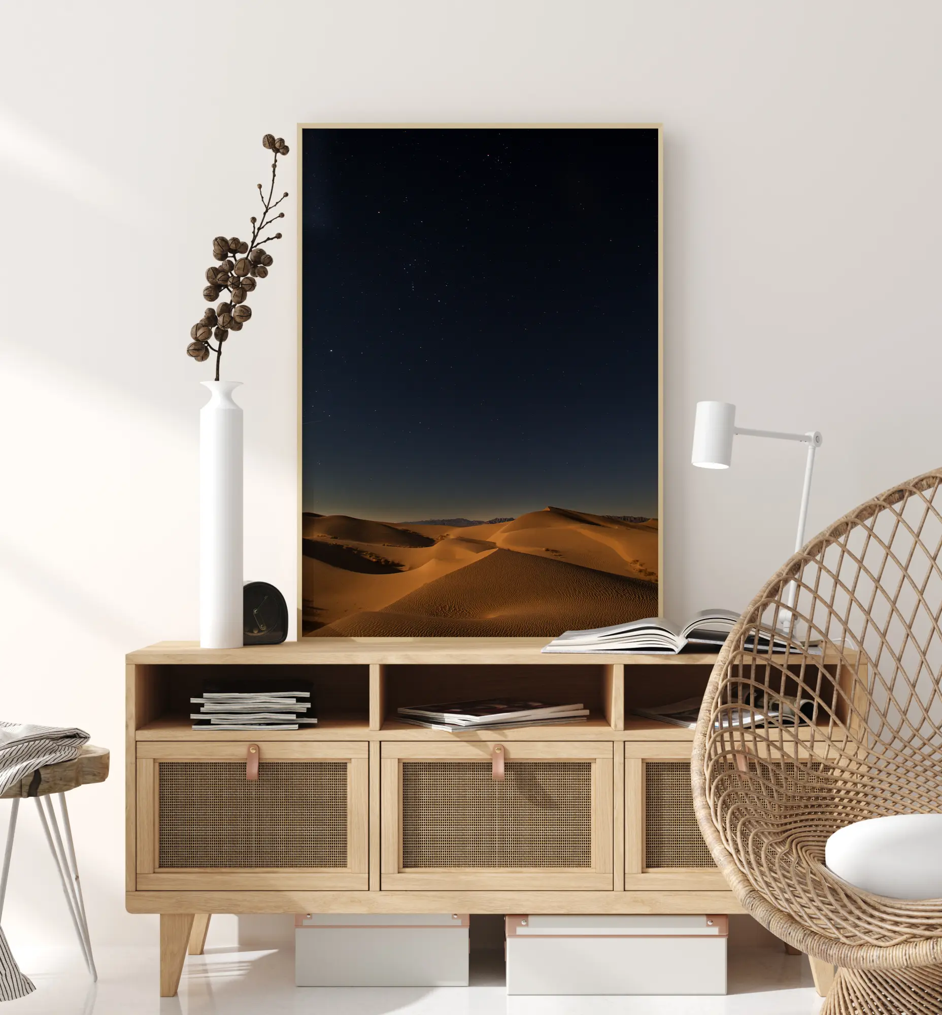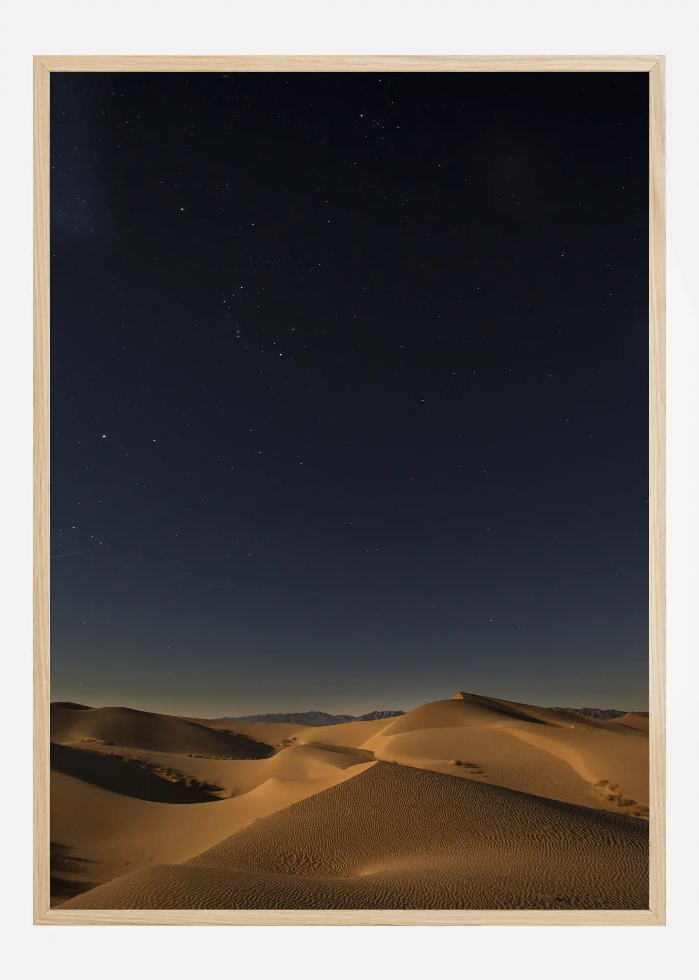 Meelitav poster, millel on kujutatud öine kõrb. Pehmed kuldkollased liivadüünid laienevad kauguses pildi allosas. Liiva kohal laotub tohutu tumesinine taevas koos pehmete tähtedega, mis on sellel hajutatud. Loo avarustunne, kui riputad selle postri oma koju.