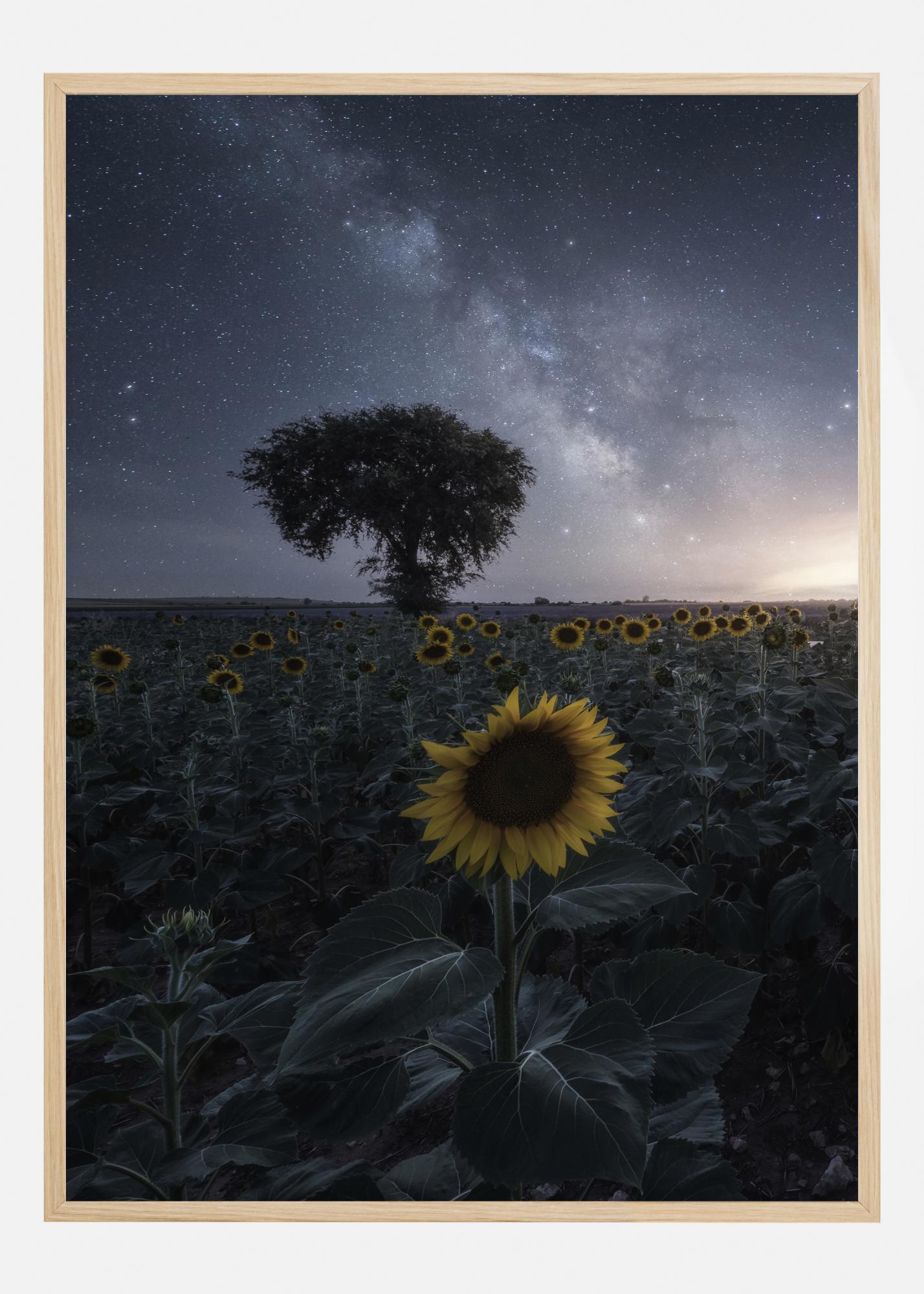 Öine päevalilledega lilleline plakat. Päevalilleväli hoiab erkkollaseid õisi öötaeva all. Seda peegeldab kauguses loojang, mis valgustab endiselt õisi, kuid valgustab ka taevast, nii et tähed on nähtavad. Sellel vaatel on kuhjaga müstikat.