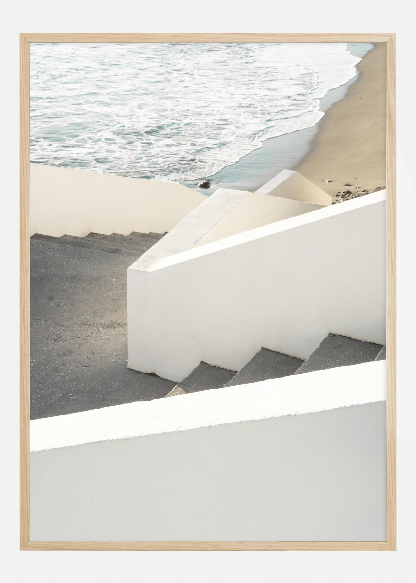 See plakat ühendab arhitektuuri ja looduse, näidates valgetreppilist struktuuri, mis viib rahulikule rannale ja vaikse mereni. Valguse ja varju mäng astmetel koos kontrastiga range arhitektuuri ja pehme rannajoone vahel loob pildi, mis on nii rahustav kui ka visuaalselt huvitav.