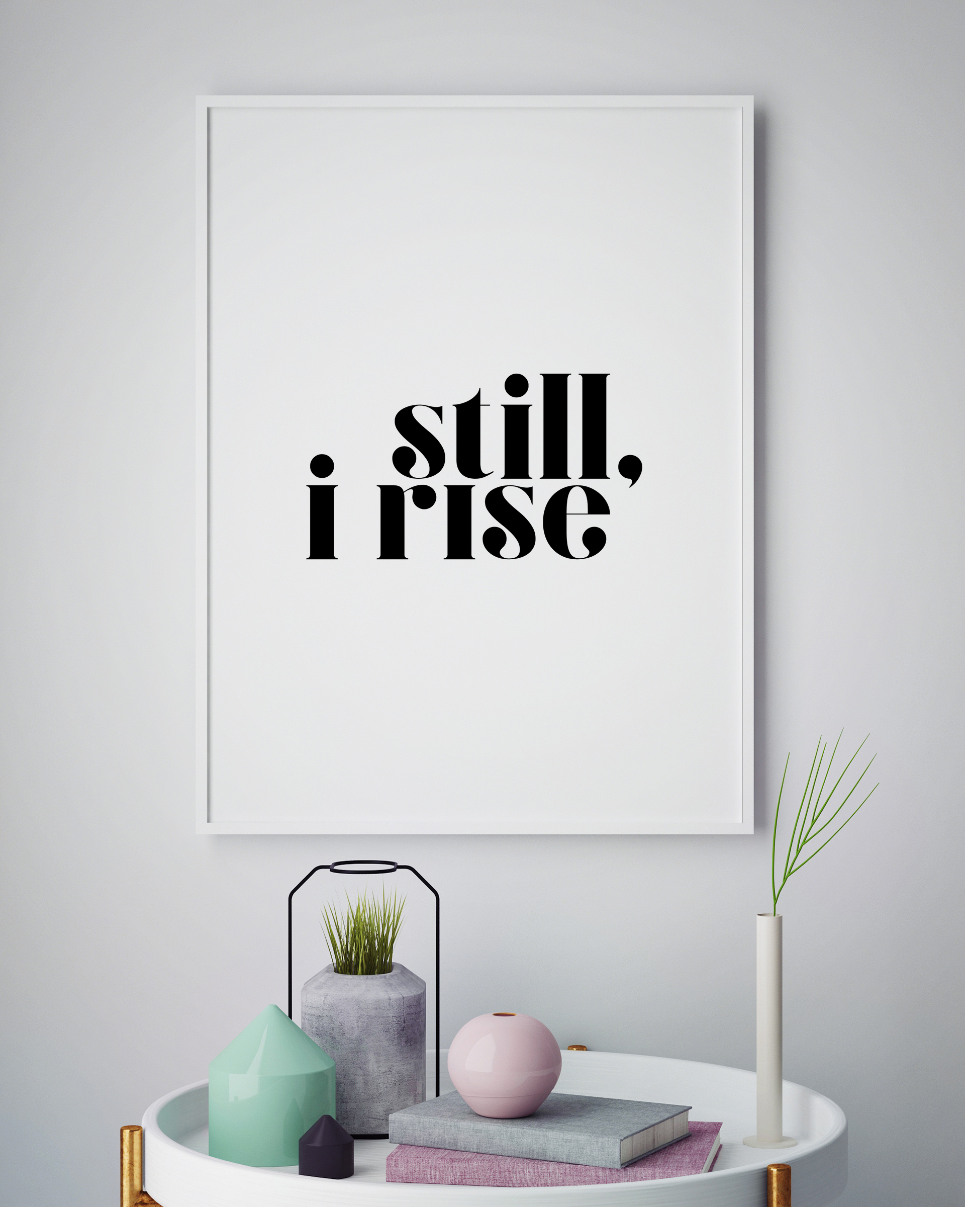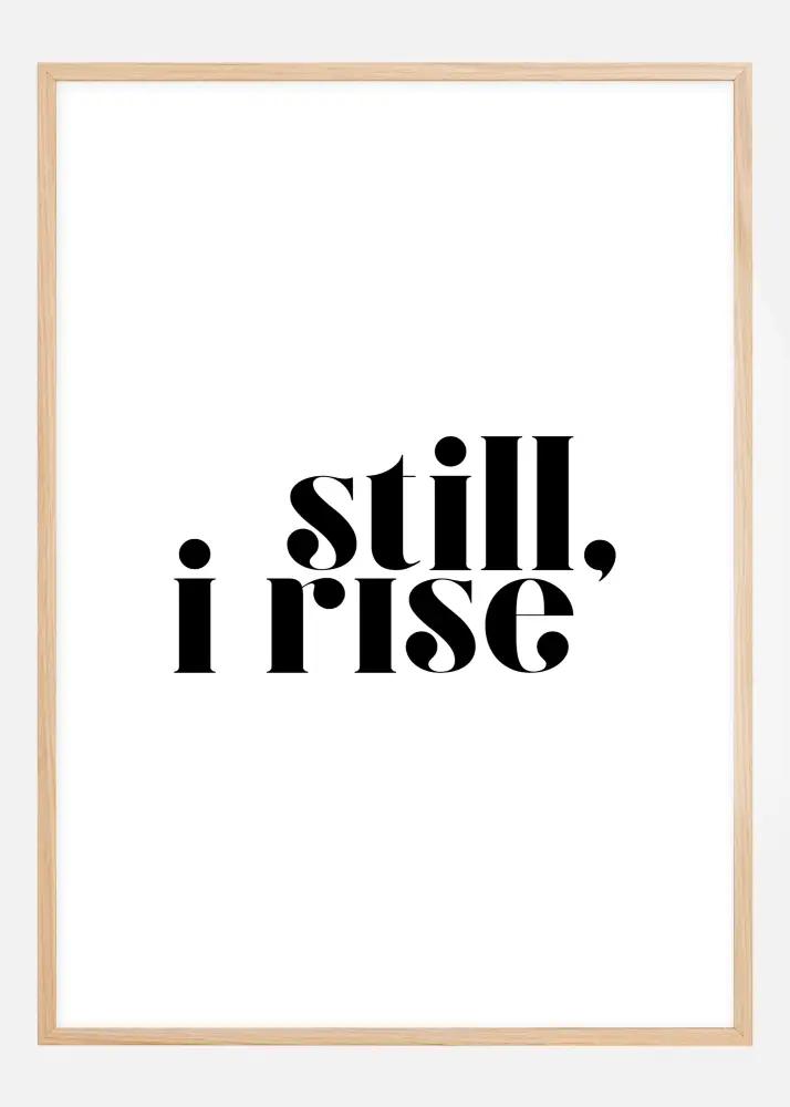 Inspiratsiooniplakat igapäevase kinnituse tsitaadiga tugevates mustades tähtedes tavalise valge tausta vastu. Anna endale jõudu edasi liikuda fraasiga ”Still, I Rise”, samal ajal kui jood hommikuti kohvi ja planeerid oma päeva.