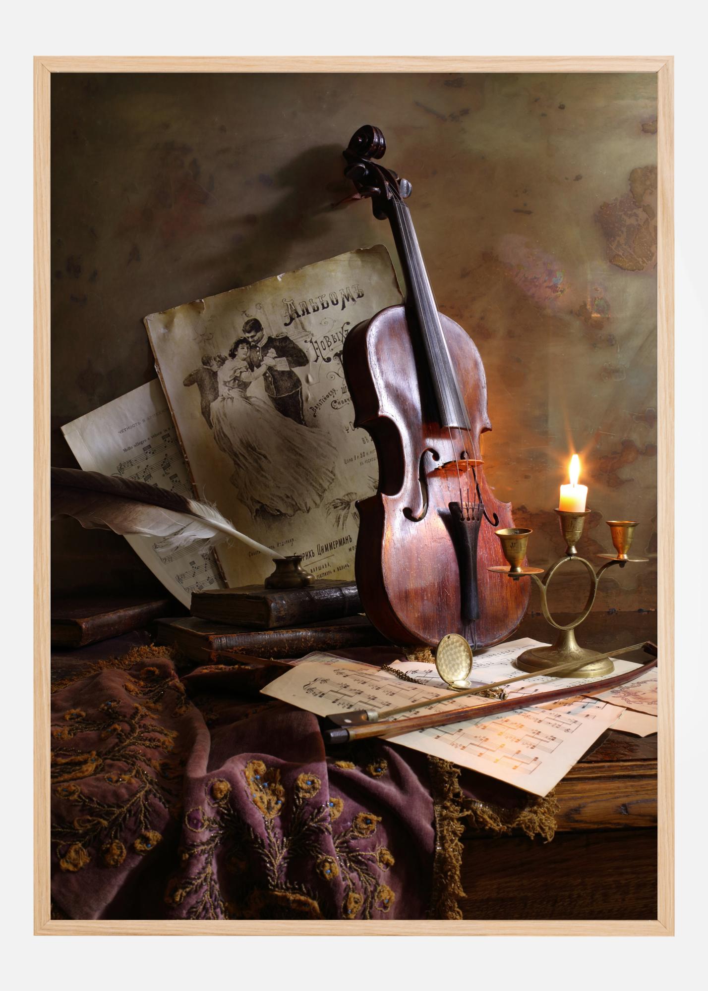 Vaikelu plakat viiuliga ja noodilehtedega. Pehme valgus paistab ereda ja valgustab viiuli mahagoni värvi, kui see vastu seina seisab. Lõuend, noodilehed, sulg, poogen ja muud tarvikud täidavad lava ning annavad ruumile sooja ja rahuldust pakkuva tunde.