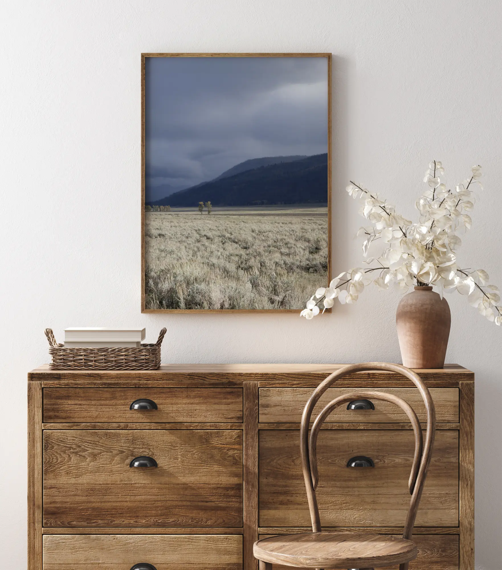 Sünge plakat eelseisva tormiga üle valge rohumaa. Tumedad pilved kogunevad kauguses siniste mägede kohal. Valge väli särab selgelt lähenevate tumedate pilvede taustal, mis peagi tabavad. Pinge kasvab, kui pilved veerevad sellesse dramaatilisse stseeni.
