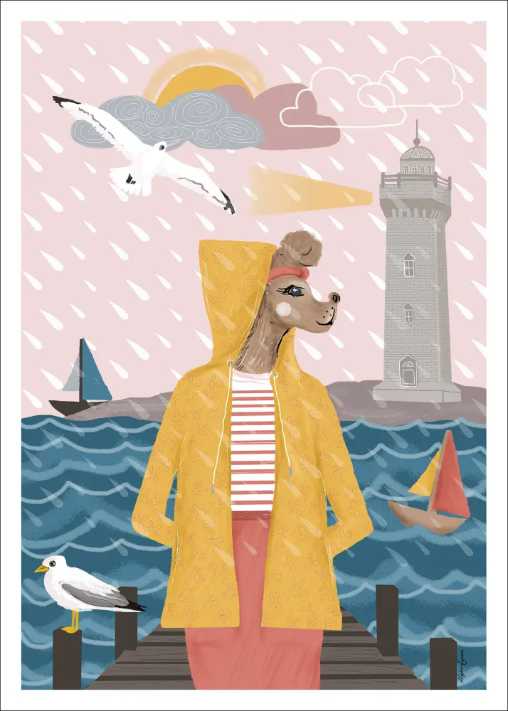 Plakat kollaažistiilis, kus on armas puudel, kes on riietatud kollasesse vihmamantlisse vihmas. Ta seisab kail väikeste siniste lainetena hakkivates lainetes. Majakas asub tagapool, kaks paati triivivad mööda ja üks kajakas lendab üle. Päike piilub just pilvede tagant välja ja on valmis kõike sellel muinasjuturaamatu stiilis lõbusal pildil ära kuivatama.
