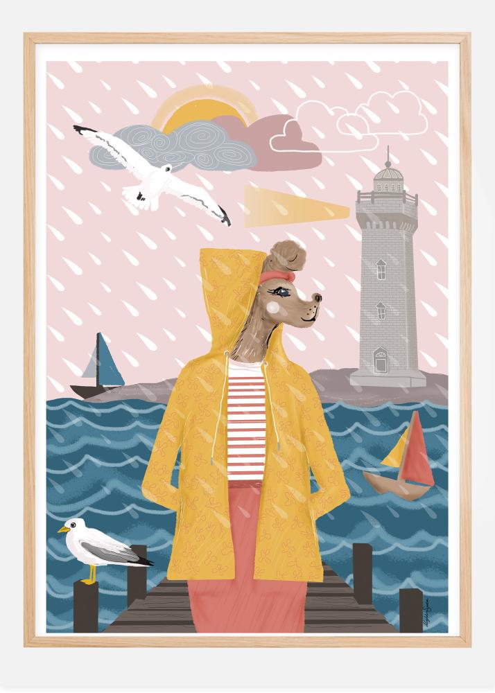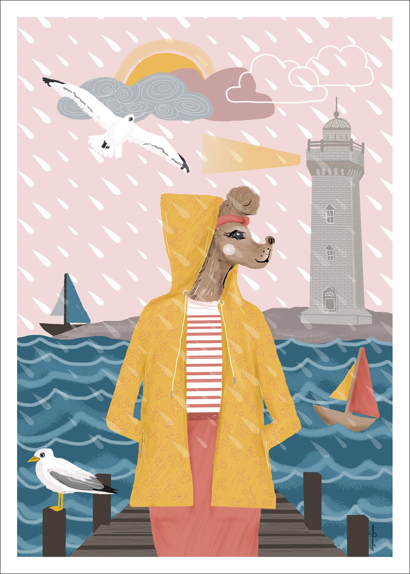 Plakat kollaažistiilis armas puudliga, kes on riietatud kollasesse vihmamantlisse vihma käes. Ta seisab kail väikeste hakkivate siniste lainete ees. Taga paistab majakas, kaks paati hõljuvad mööda ja üks kajakas lendab üle. Päike piilub just läbi pilvede ja on valmis kõike kuivaks tegema selles lõbusas pildis, mis on muinasjuturaamatu stiilis.