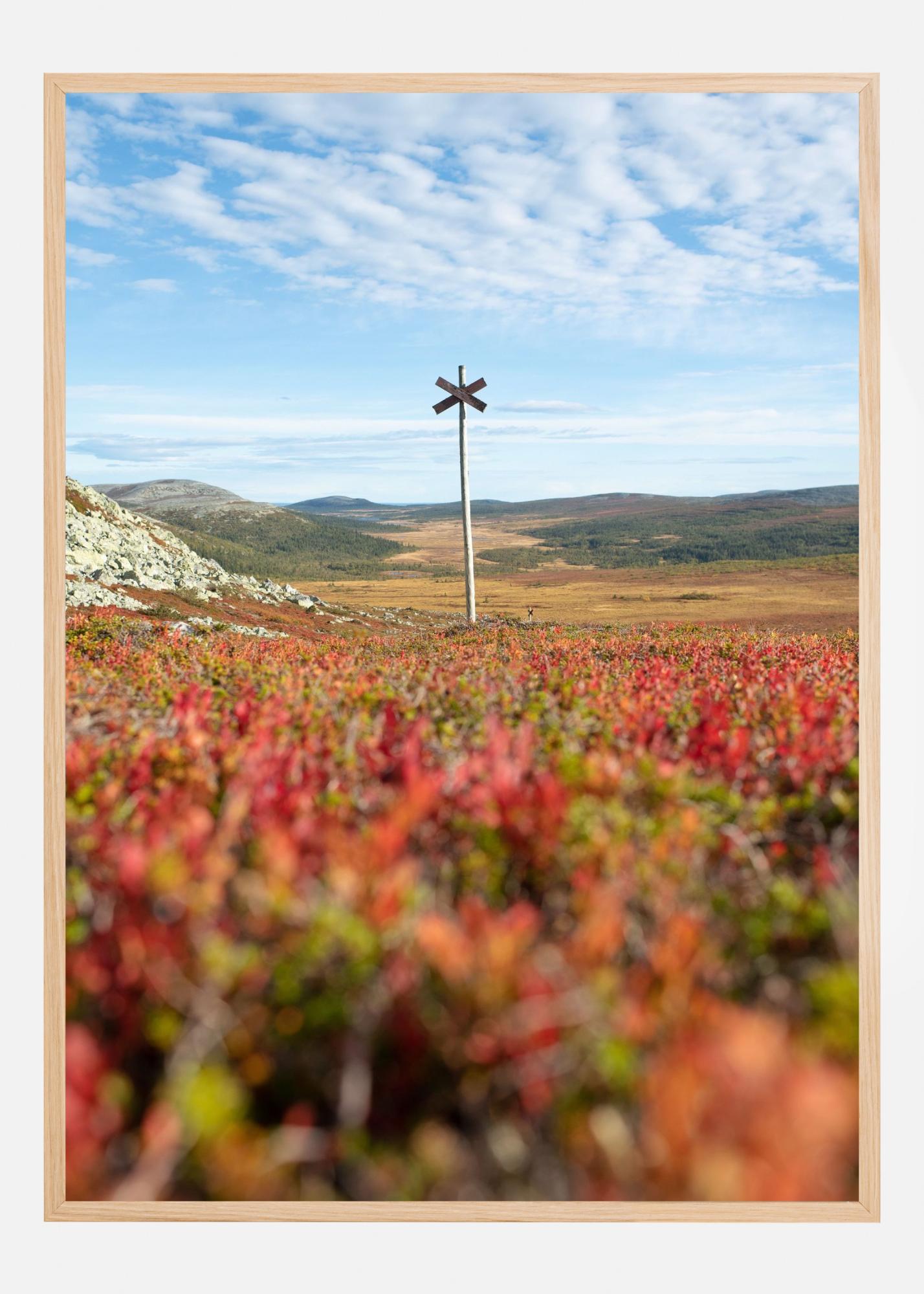 See meeleolukas poster kujutab avarat mägimaastikku, mille keskmes on üksik puidust rist, mis tõmbab pilku looduse rüpes. Motiivis on tunda rahu, vabadust ja põhjamaist metsikut loodust – pilk liigub üle avarate väljade ja pehmelt lainetavate küngaste. Täiuslik plakat sulle, kui armastad looduspilte, mägesid, matkamist ja skandinaavialikku esteetikat ning soovid kodus luua harmoonilist ja maalähedast õhkkonda.