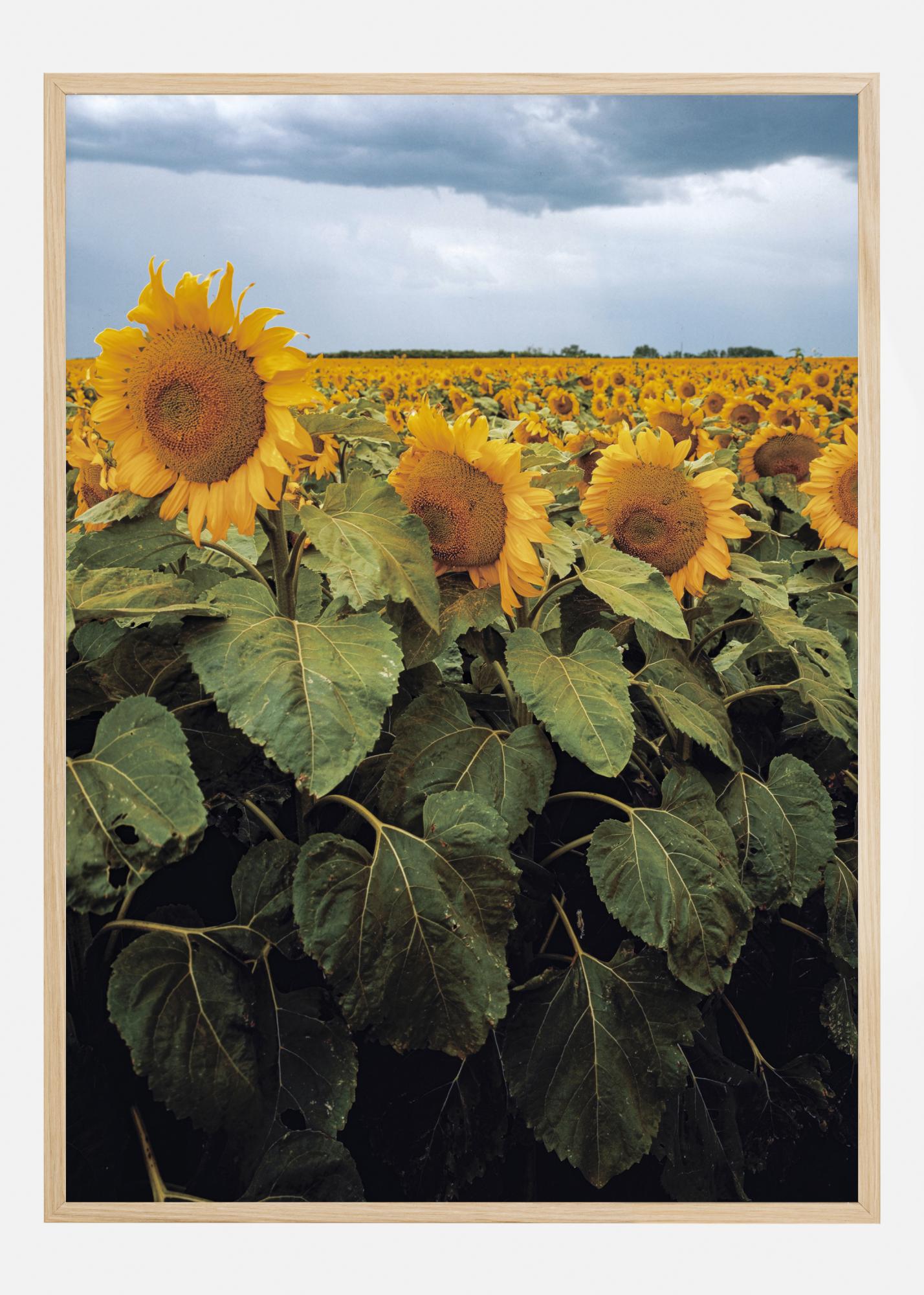 Silmapaistev plakat suure päevalillede väljaga. Pilt on täidetud lillede pikkade roheliste varte ja lehtedega. Ülal hõljub helekollaste päevalillede meri, mis sirutuvad kaugusesse ja sinise taeva poole. Tõsta oma tuju selle rõõmsa trükiga.