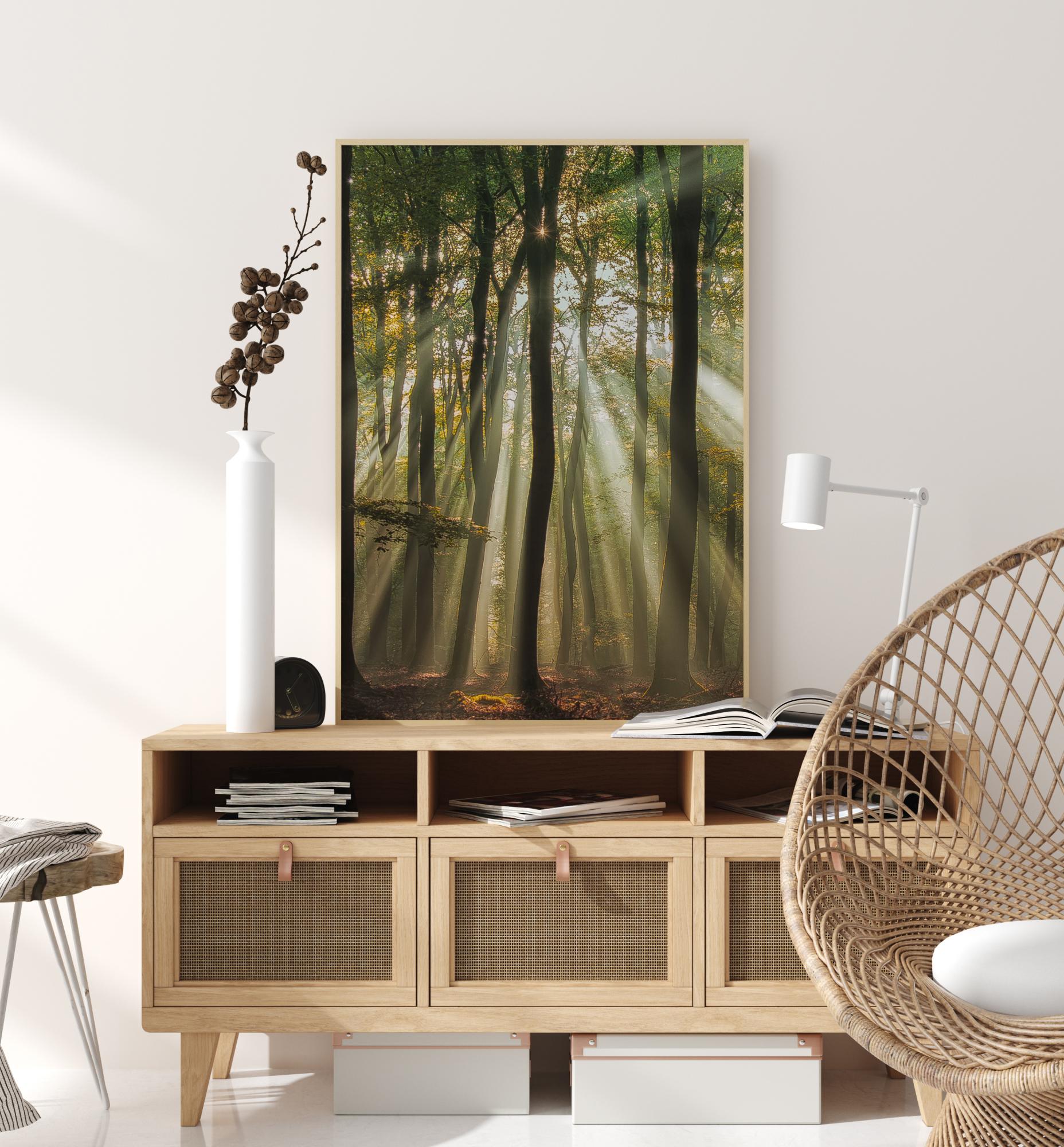 Metsaposter päikesekiirtega, mis langevad kõrgete puutüvede vahel. Pikad tüved tõmbavad pilgu pildi kaudu ülespoole. Nagu täht, paistab päike ülaosas läbi avause ja heidab pehmeid kiiri puude vahele, valgustades metsa pehme rohelise valgusega. Kujutage ette jalutuskäiku rahulikus metsas.