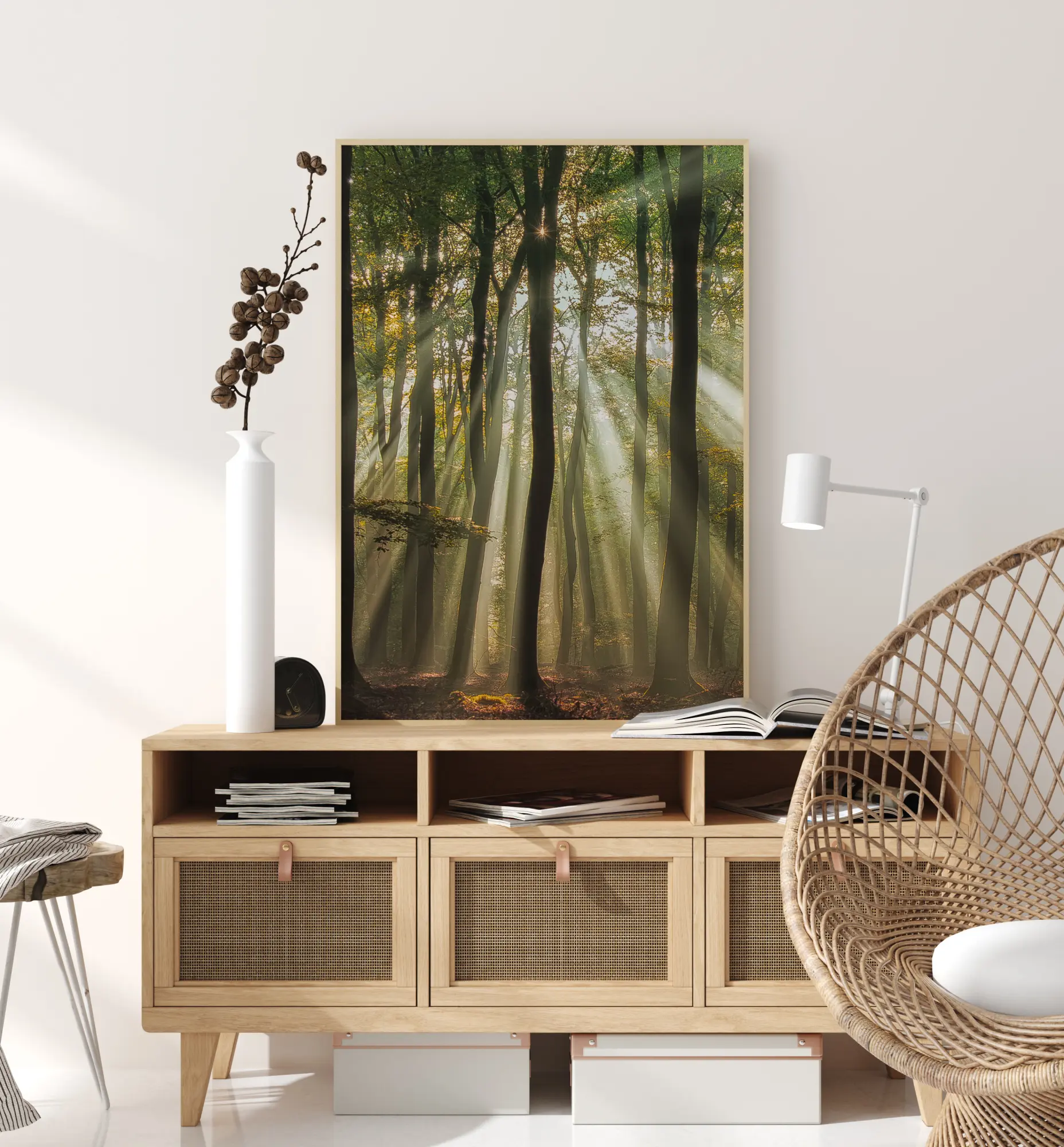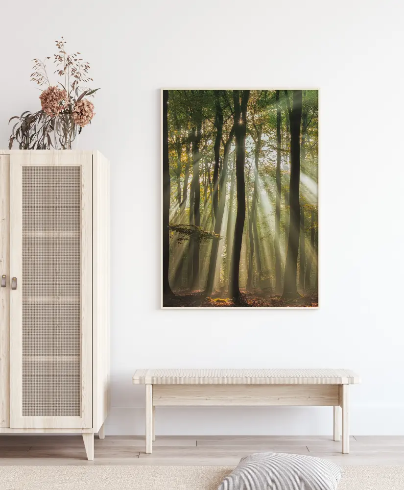 Metsaplakat päikesekiirtega, mis langevad kõrgete puutüvede vahele. Pikad tüved juhivad pilgu pildi ülespoole. Nagu täht paistab päike ülevalt läbi ava ja heidab pehmeid kiiri läbi puude, valgustades metsa pehme rohelise säraga. Kujuta ette jalutuskäiku rahulikus metsas.