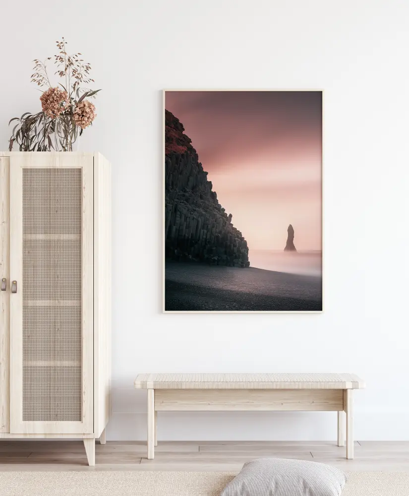 Epohhimaaline maastikuposter päikesetõusuga Islandi mustal liivarannal Reynisfjara. Vaata üle mere üksildase kalju poole või naudi basalttornide imelikke korstendikujulisi vorme, kui need tõusevad taeva poole. See on maagiline koht, mida läbistab roosa kuma.