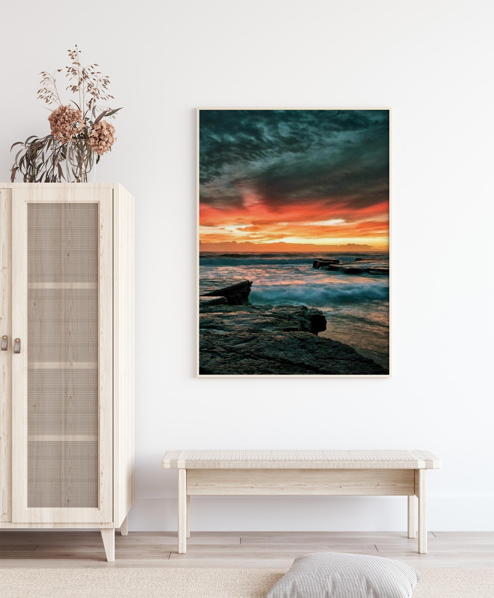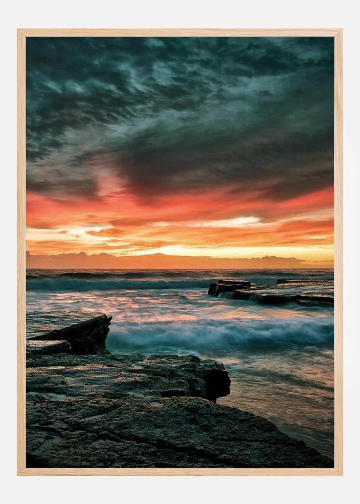 Eepiline plakat päikeseloojanguga vee kohal. Merelained löövad vastu tasast kaljurannikut. Tumedaid pilvi on otse kohal eredalt punase loojanguga madalal horisondil, luues dramaatilise ja muljetavaldava pildi, mis hoiab teie tähelepanu.