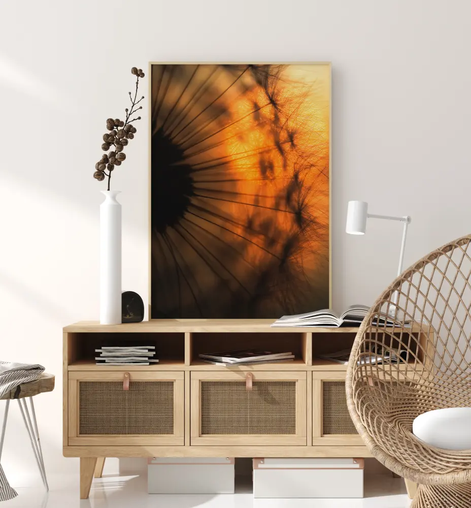Lähivõtte plakat võililleõisiku kellukast koos heleda, punakasroosa loojanguga, mis voogab läbi. Päikese heledad oranžid toonid on summutatud suure võilillepeaga, mis peegeldab päikese massiivset kuju, mis on just näha seemnete kaudu selles eepilises trükises.