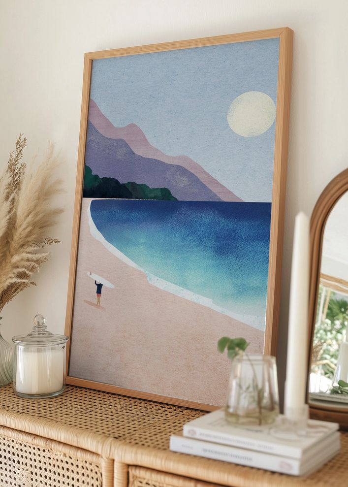 See plakat jäädvustab vabaduse ja seikluse hetke – üksik surfar kaugel rannal. Pehmed liivatoonid loovad kauni kontrasti sügavsinise merega, mis mängib türkiisi ja sinise varjundites. Hele taevas mõjub rahustavalt ning suur kollane päike tasakaalustab kogu motiivi. See on ideaalne print neile, kes unistavad põgenemisest mere äärde.