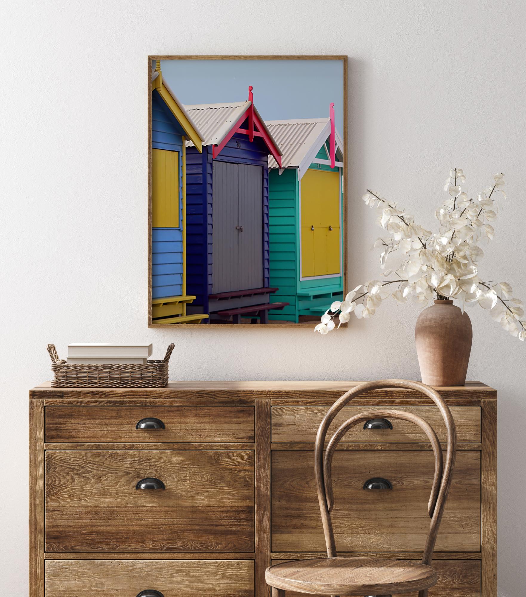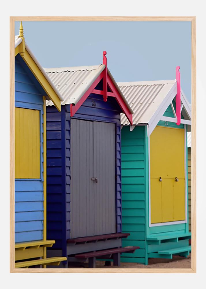 Helge plakat värvikate randamajakestega. Iga majake on värvitud mitut elavat värvi, nagu kollane, sinine, roosa ja türkiis. Tundes suvise ranna meeleolu, kui riputate selle neutraalsele seinale ja lisate oma koju värvi.