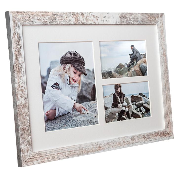 Stiilne vintaažraam laia raamiprofiiliga, millel on kulunud välimus valges ja puidu toonis. Annab sinu piltidele lisamõõtme ja sobib ideaalselt, kui soovid tõelist vintaažtunde. Tutiraamil on ruumi 3 pildile erinevates suurustes.