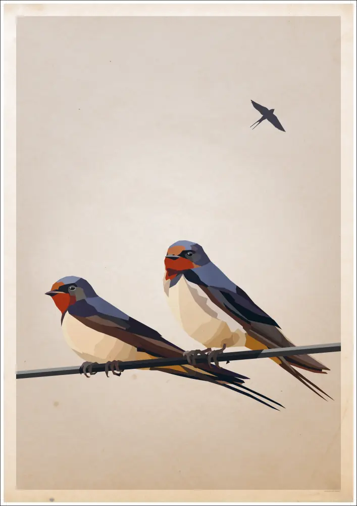 Loomaplakat kolme pääsukesega, mis on joonistatud värviplokkidena. Kaks punapõskset lindu istuvad ühel traadil, mis on pildi alaosas pingul. Kolmas lind lendab kaugusesse. Pääsukeste heledad sinised ja punased värvid näevad kodus lihtsal neutraalsel seinal head välja.
