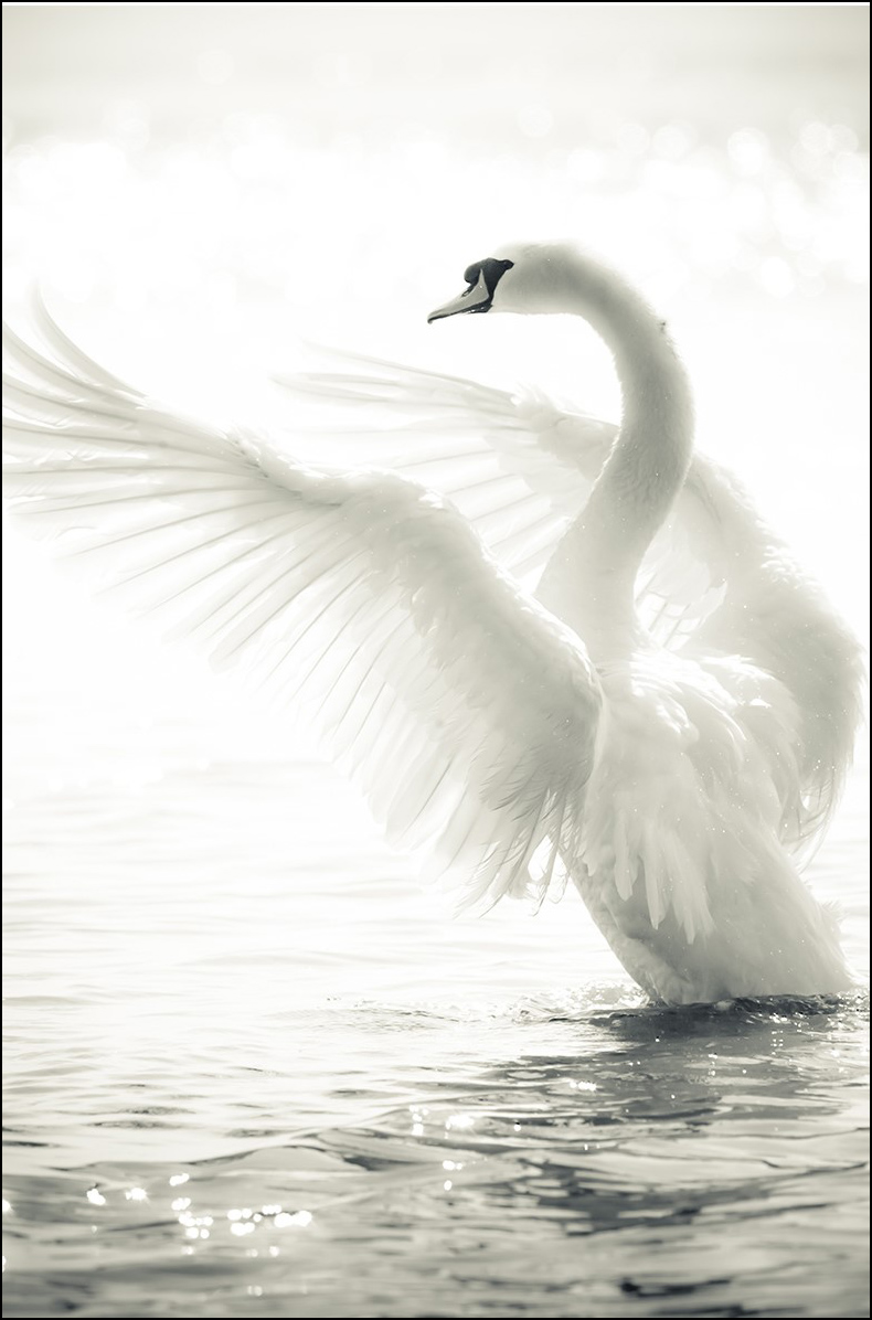 Kaunis mustvalge foto luigest, kes sirutab oma tiivad taeva poole ja naudib päikesepaistet. Plakatil on elegantne ja rahulik tunne, mis sobib hästi nii lastetuppa kui ka muusse kodusse. Motiiv sobib ka avalikku keskkonda, kus on meeldiv silmi puhata.