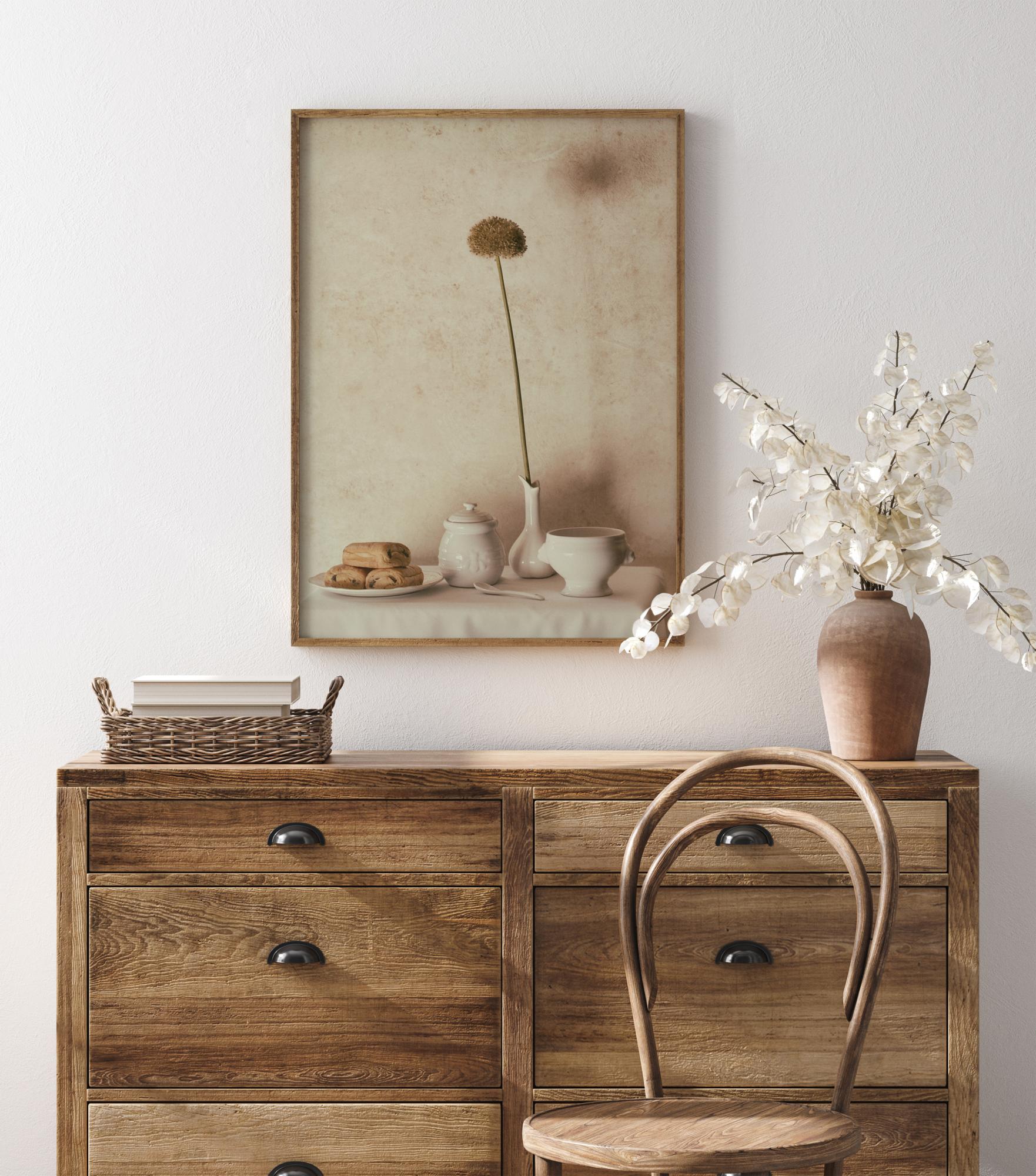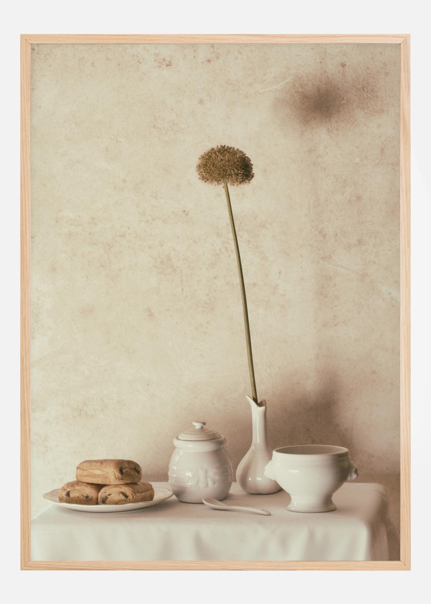 Elust muinasjutuga pain au chocolate kausis, meepurk ja vaas ühe lillega. See magus hommikusöök on asetatud neutraalse valge seina taustale, et luua lihtne, kuid tõhus õhkkond. Kujutage ette, et olete mandril, kui naudite oma hommikusööki sellega oma köögis.