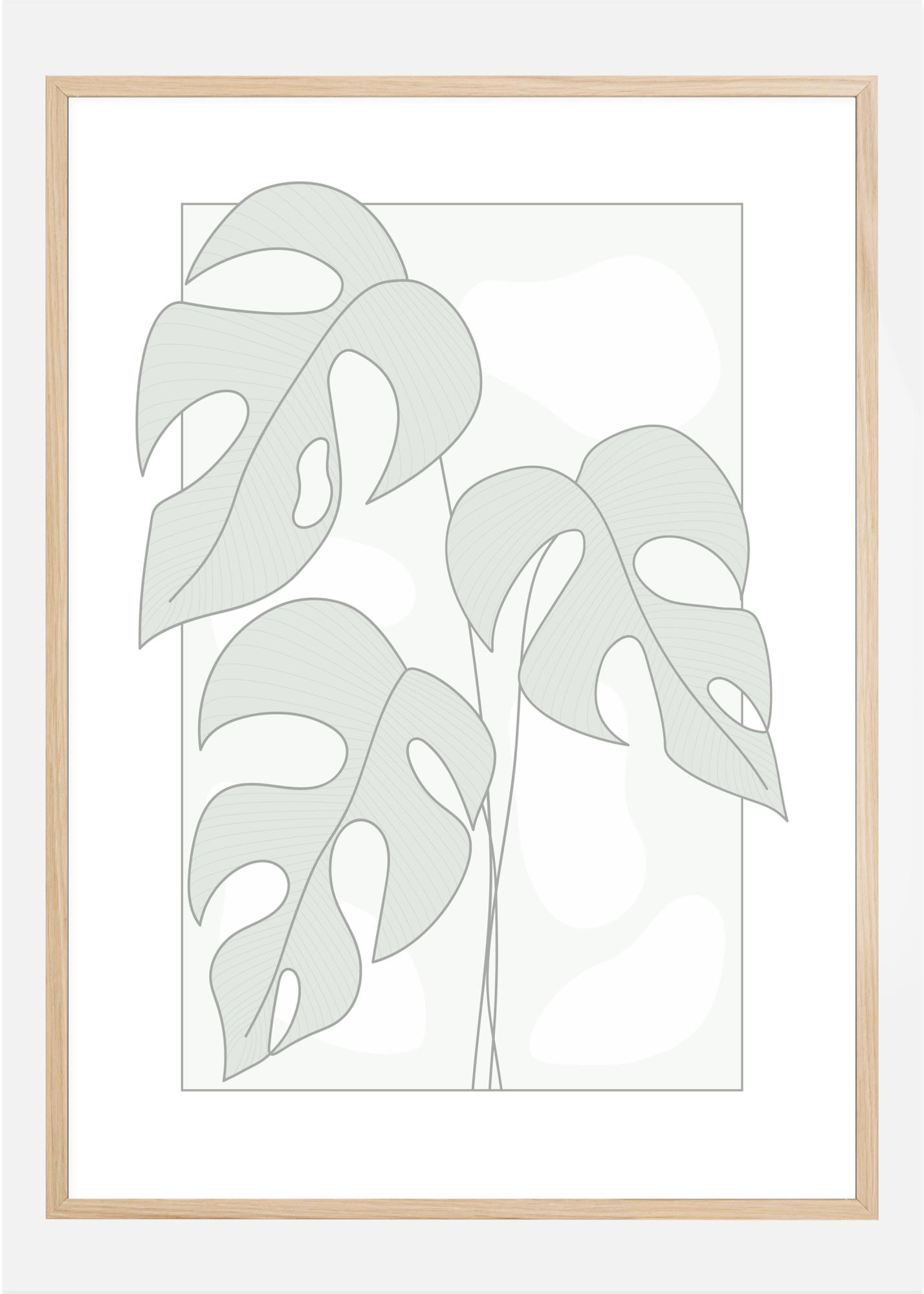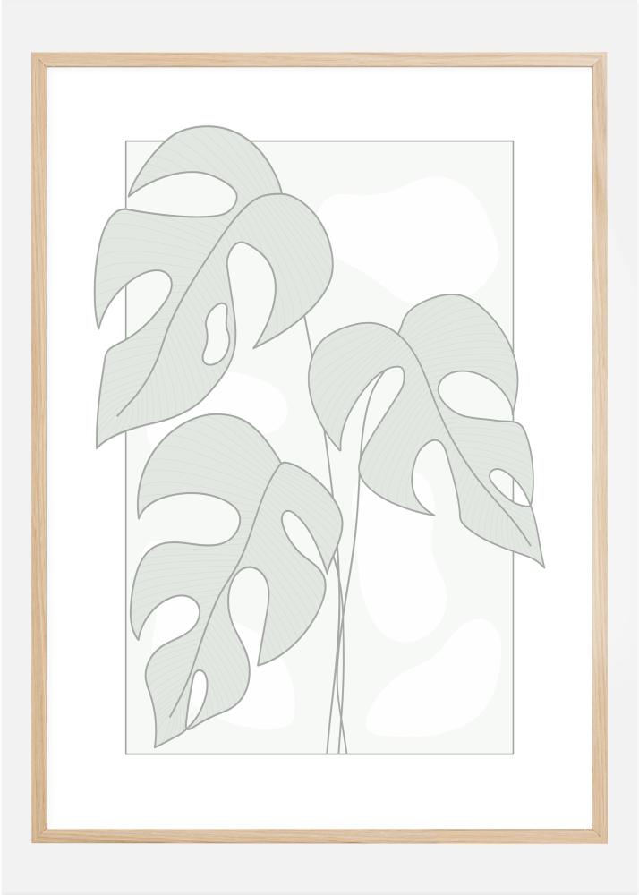 Lihtne plakat illustratiivsete monsteralehtedega. Kolm suurt lehte täidavad pildi, igaüks neist pehme halli tooniga. Õhemad jooned moodustavad varred, kui need elegantsed lehed aukudega rippuvad alla selles pildis. Hoidke see diskreetne, riputades selle pehme rohelise seina peale, et saavutada looduslik tunne.