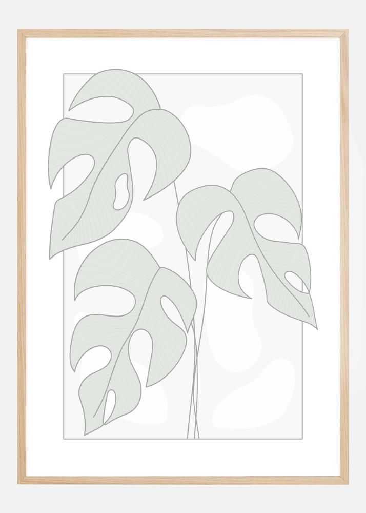 Lihtne poster illustratiivsete monstera lehtedega. Kolm suurt lehte täidavad pildi, igaüks pehme halli tooniga. Õhemad jooned moodustavad varred, kui need elegantsed aukudega lehed siin rippuvad. Hoidke seda diskreetse, riputades selle pehmele rohelisele seinale, et luua loodustunnet.